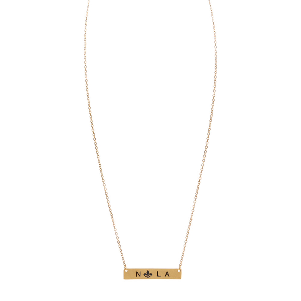 Details • Necklace Size : 16" + 3" L • Pendant Size : 1.4" X 0.25" • Show off your city pride with this NOLA bar pendant necklace featuring a sleek rectangular charm engraved with a fleur-de-lis accent. A chic piece that blends simplicity with personality, perfect for everyday wear or as a thoughtful gift celebrating New Orleans-inspired style. • Lead and Nickel Compliant