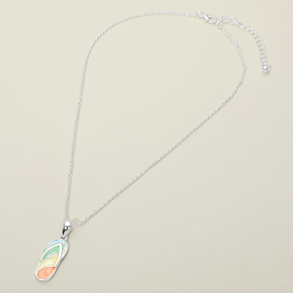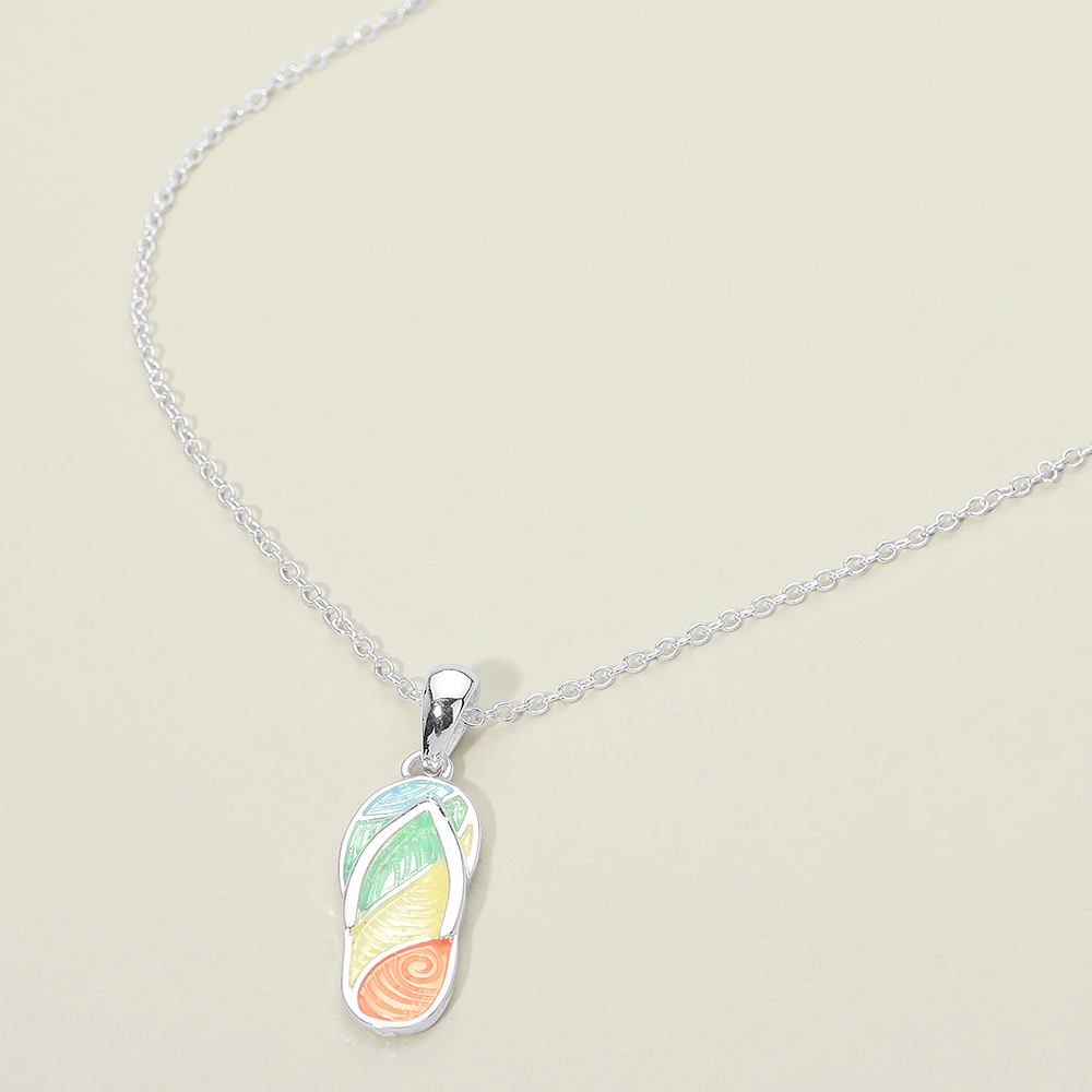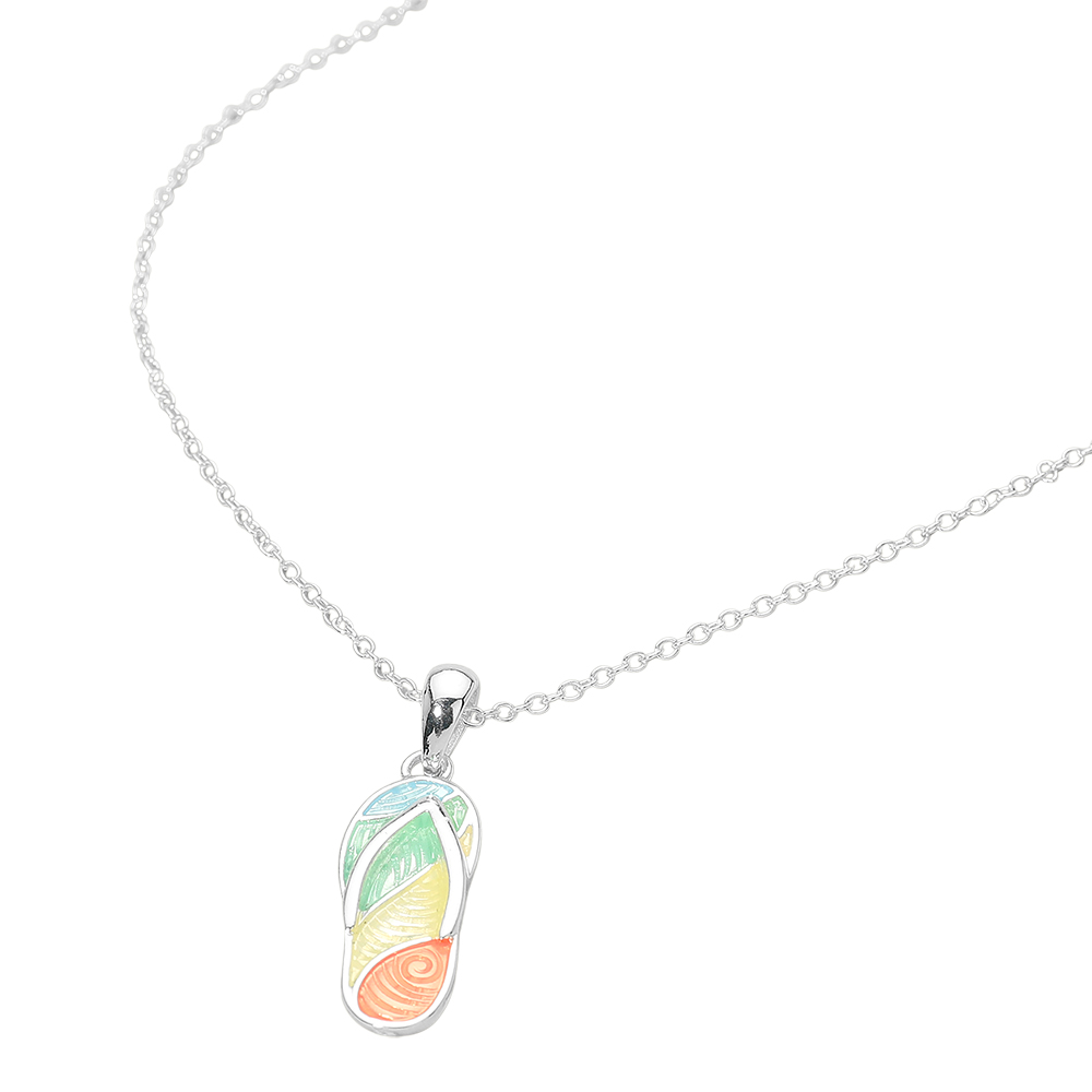 Details • Necklace Size : 18" + 3" L • Pendant Size : 0.5" X 1.5" • Flip flop charm pendant necklace designed with a playful, beach-inspired silhouette that captures relaxed summer style. Lightweight and easy to wear for everyday looks or vacation outfits. A cheerful statement piece ideal for gifting, layering, or boutique collections with resort and casual fashion themes. • Lead and Nickel Compliant
