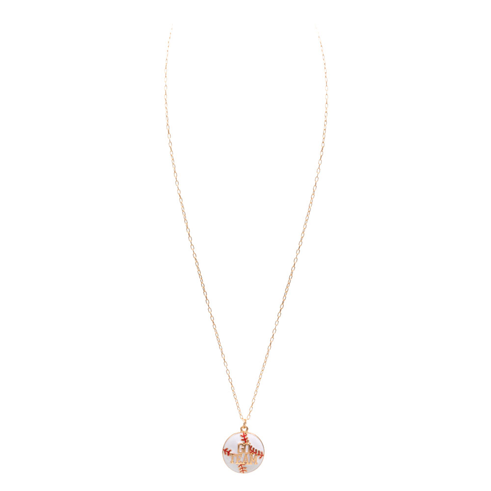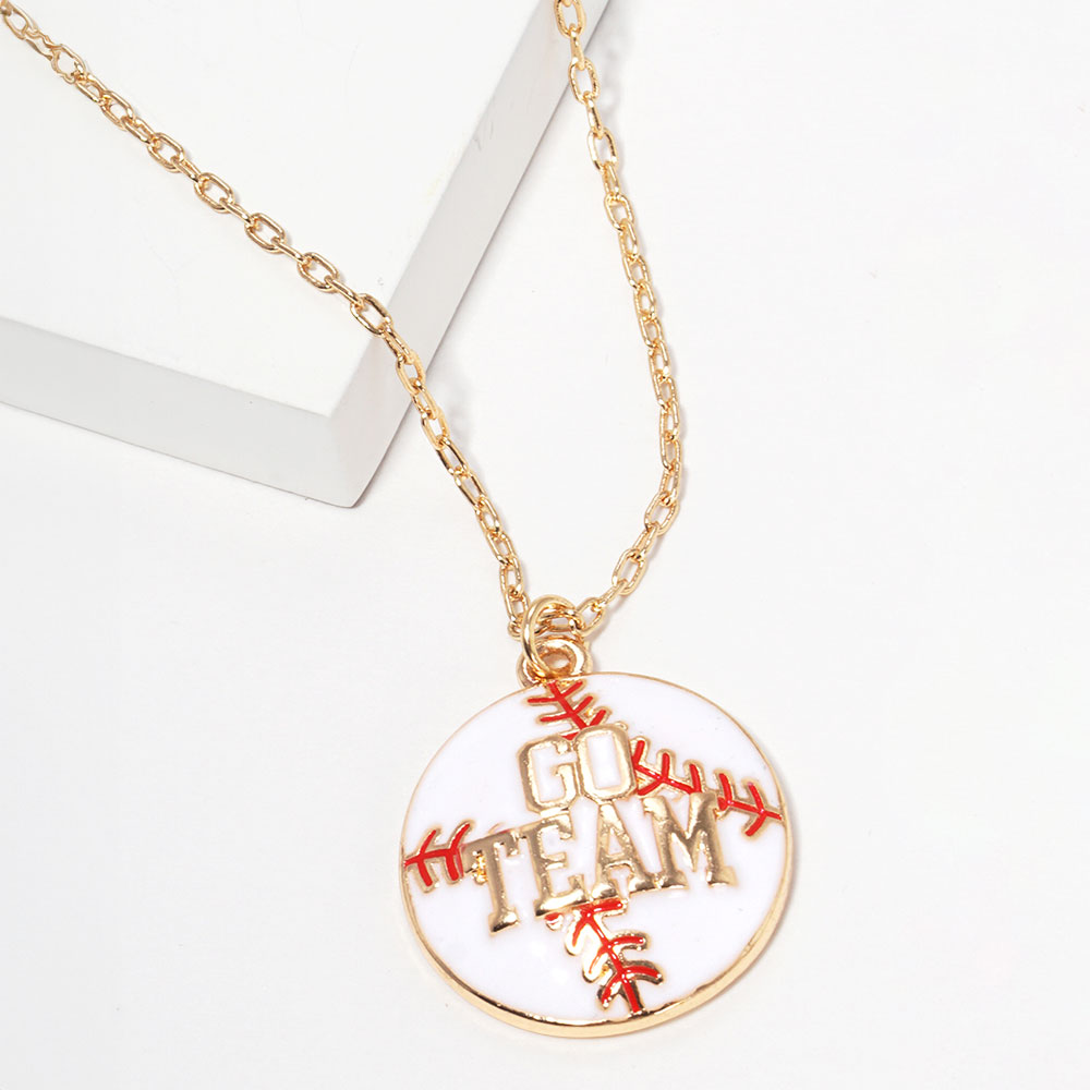 Details • Necklace Size : 16.5" + 3.25" • Pendant Size : 0.8" X 0.9" • Round baseball-inspired pendant necklace featuring a bold “Go Team” design for spirited everyday styling. Ideal for game day looks, fan-focused collections, and sporty gift assortments, this necklace delivers playful team energy while remaining easy to pair with casual outfits. • Lead and Nickel Compliant