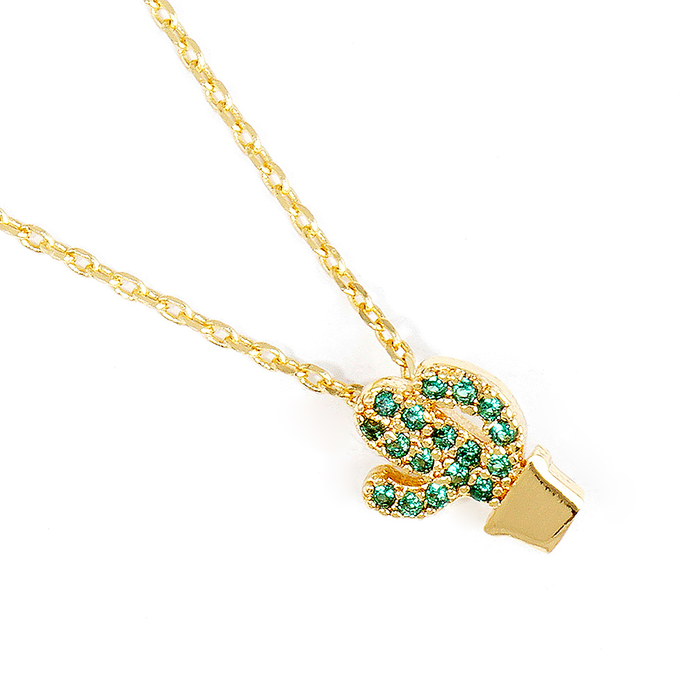 Gold Dipped CZ Stone Paved Cactus Pendant Necklace