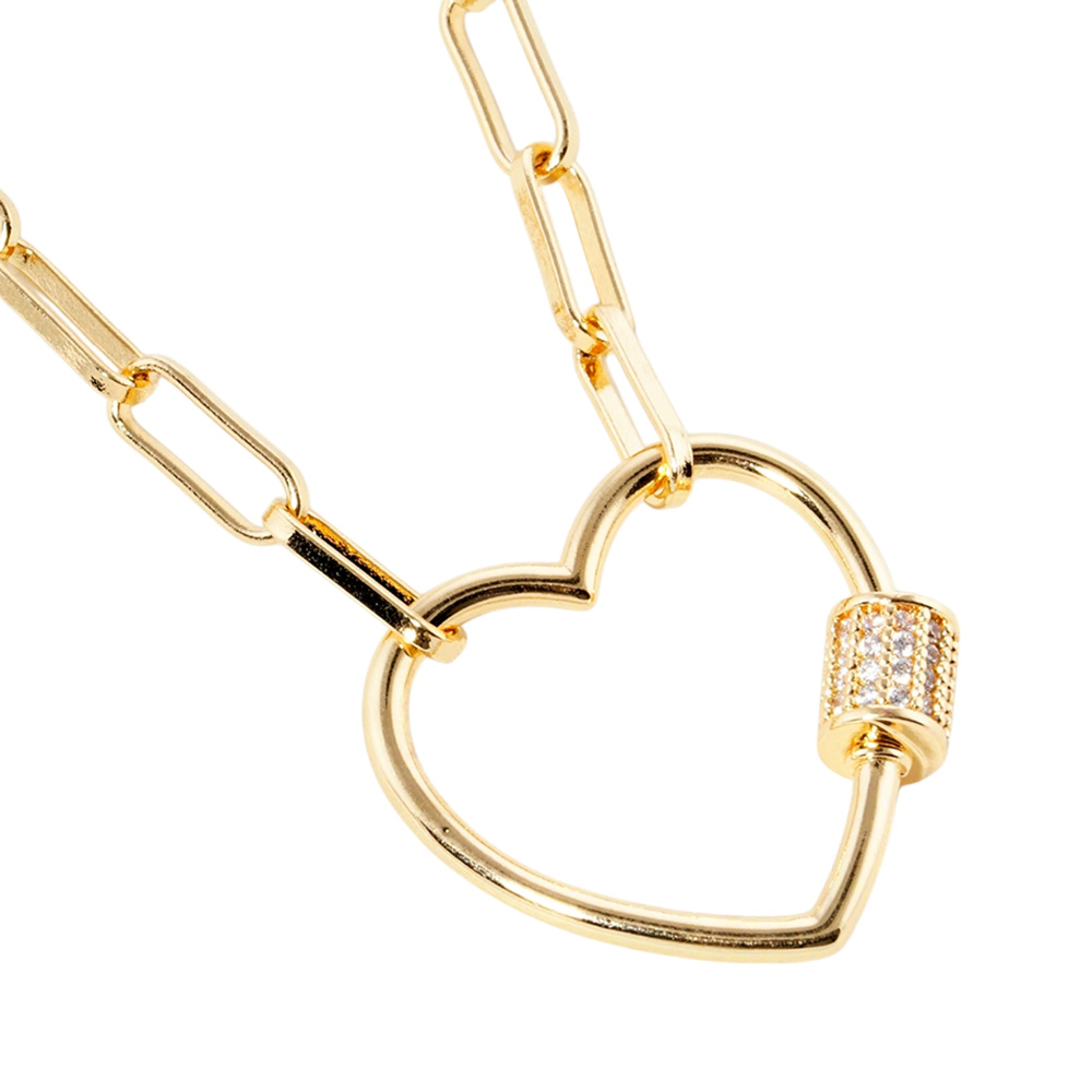 Gold Dipped CZ Stone Paved Open Heart Carabiner Pendant Paperclip Chain Necklace