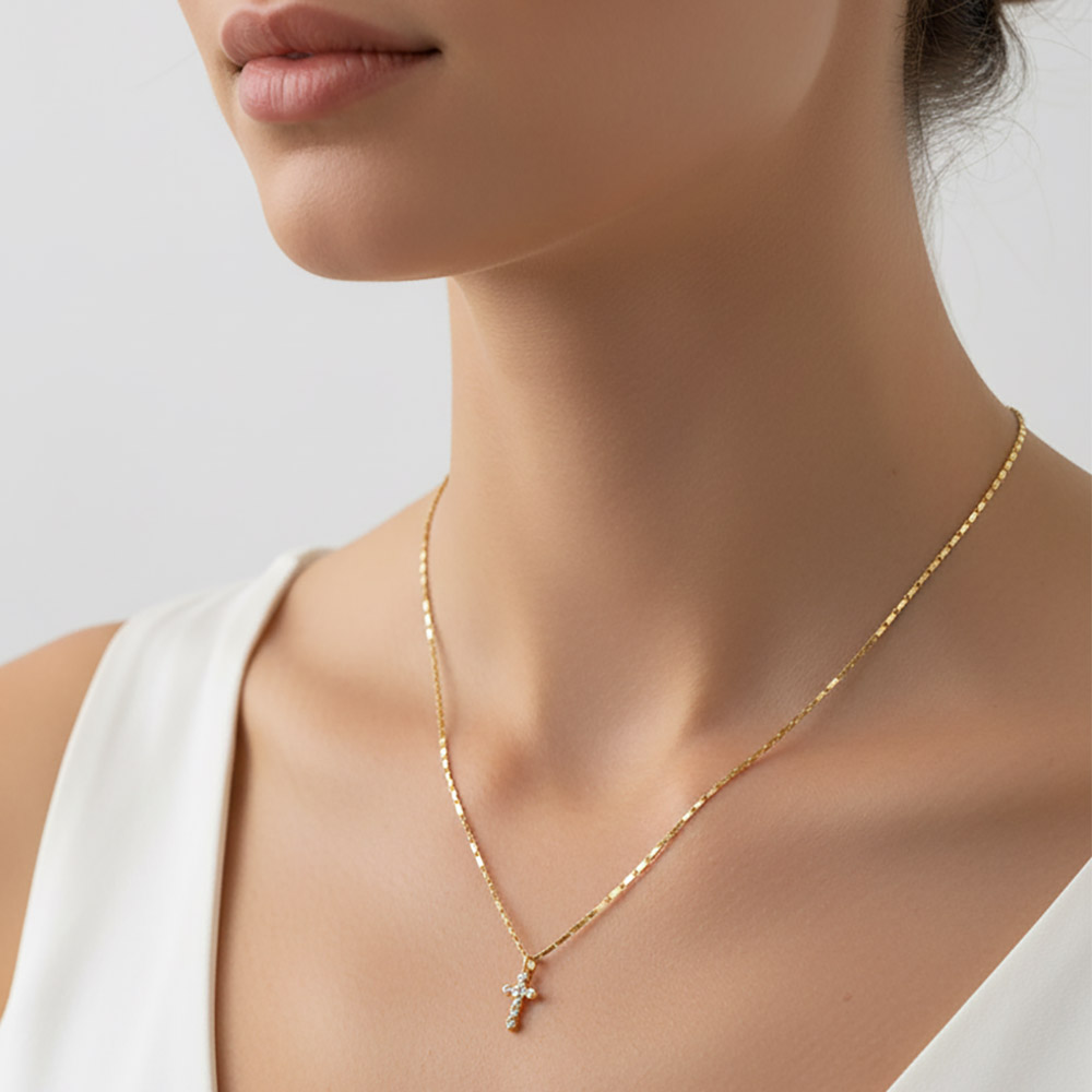 • This minimal cross pendant necklace showcases a clean, timeless design accented with subtle sparkle for everyday elegance. Lightweight and easy to style, it pairs effortlessly with casual or dress looks and works beautifully layered or worn solo as a meaningful, refined accessory.