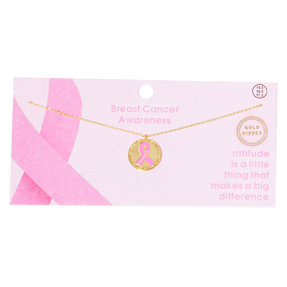Details • Necklace Size : 15.5" + 2" L • Pendant Size : 0.6" X 0.6" • Celebrate resilience with this Pink Ribbon Fighter necklace, a powerful symbol of strength, courage, and awareness. Featuring a round pendant with inspiring words of love, faith, and hope, this meaningful piece honors warriors and survivors while spreading a message of support. • Lead and Nickel Compliant • Made In Korea • Gold Dipped