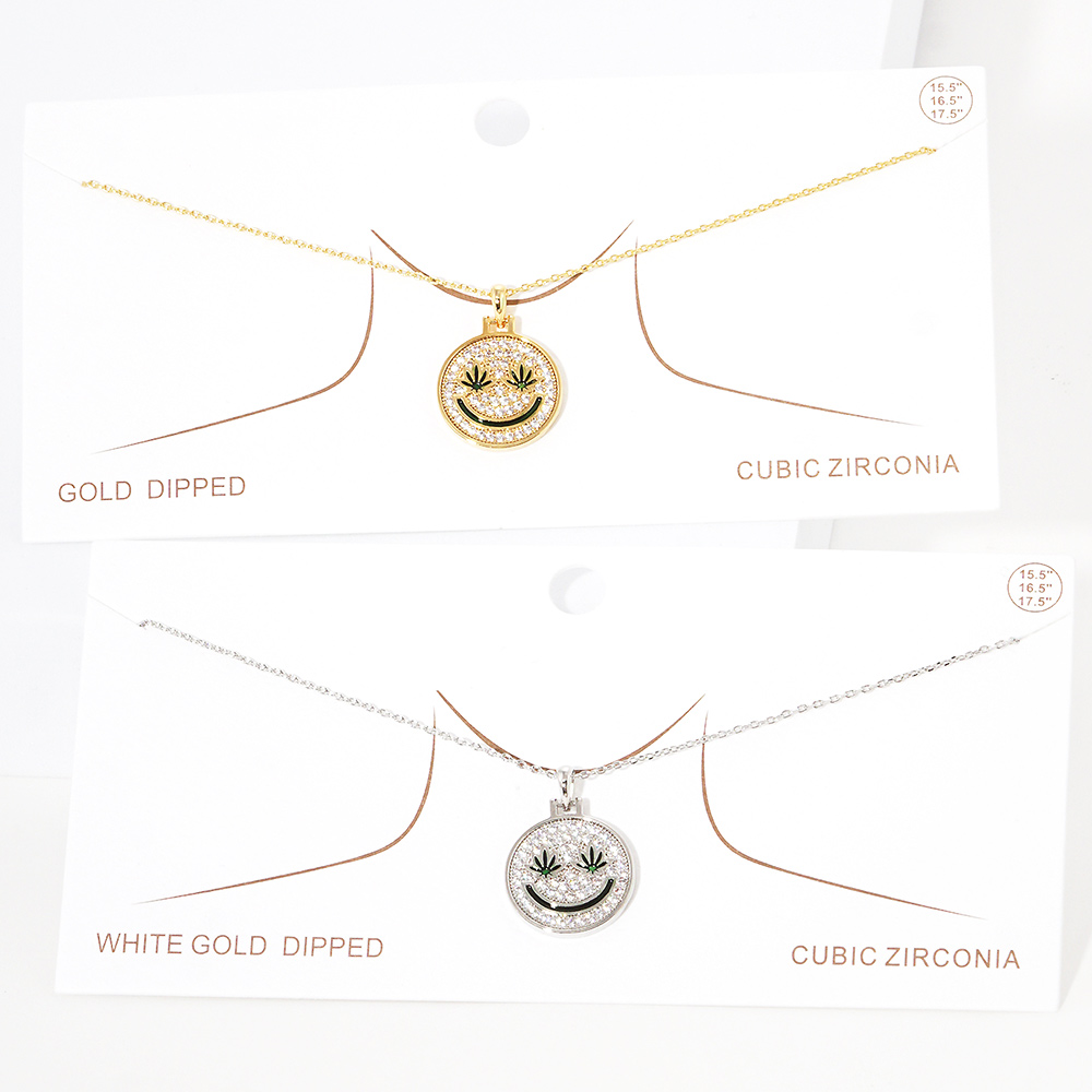 White Gold Dipped Hemp Leaf Pointed CZ Smile Pendant Necklace