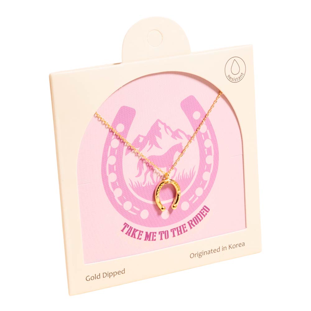 Details • Necklace Size : 16" + 2" L • Pendant Size : 0.4" X 0.6" • Western-inspired horseshoe pendant necklace designed to bring symbolic style and everyday charm. A meaningful accent for rodeo outfits, country-themed collections, festivals, and gift assortments. Ideal for layering, boutique displays, and customers drawn to western fashion with a timeless, lucky touch. • Hypoallergenic • Made In Korea • Gold Dipped