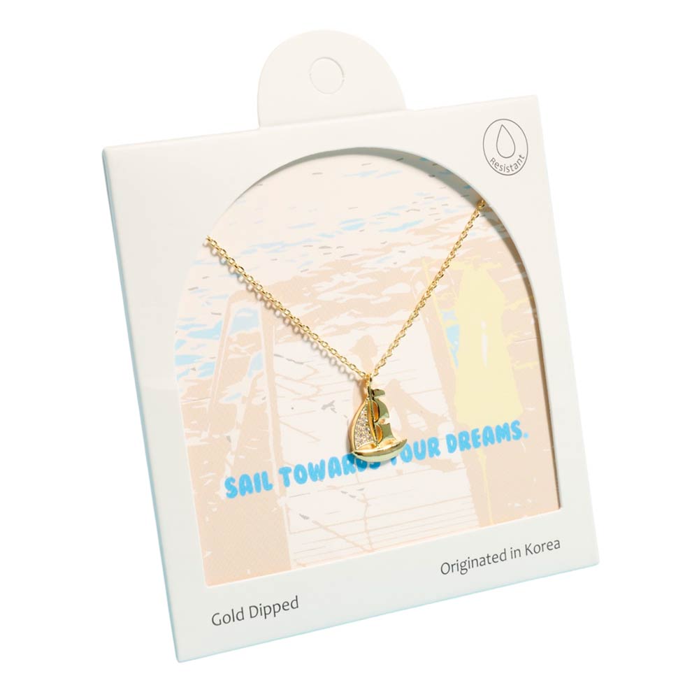 Details • Necklace Size : 16" + 2" L • Pendant Size : 0.4" X 0.6" • Sailboat charm pendant necklace symbolizing adventure, freedom, and moving forward. Designed as a meaningful everyday accessory, this necklace works beautifully for gifting, layering, or travel-inspired collections. A timeless nautical accent ideal for boutique jewelry assortments and seasonal displays. • Gold Dipped • Hypoallergenic • Made In Korea