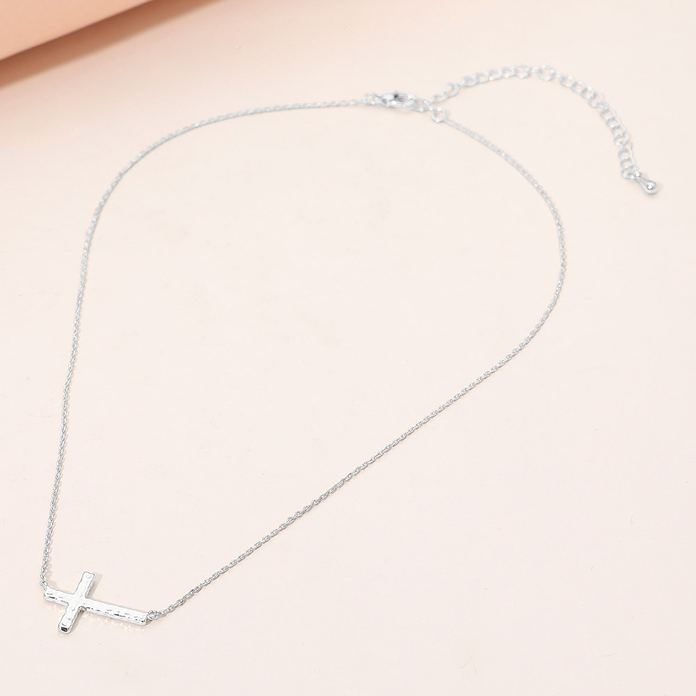 Hammered Metal Sideways Cross Pendant Necklace