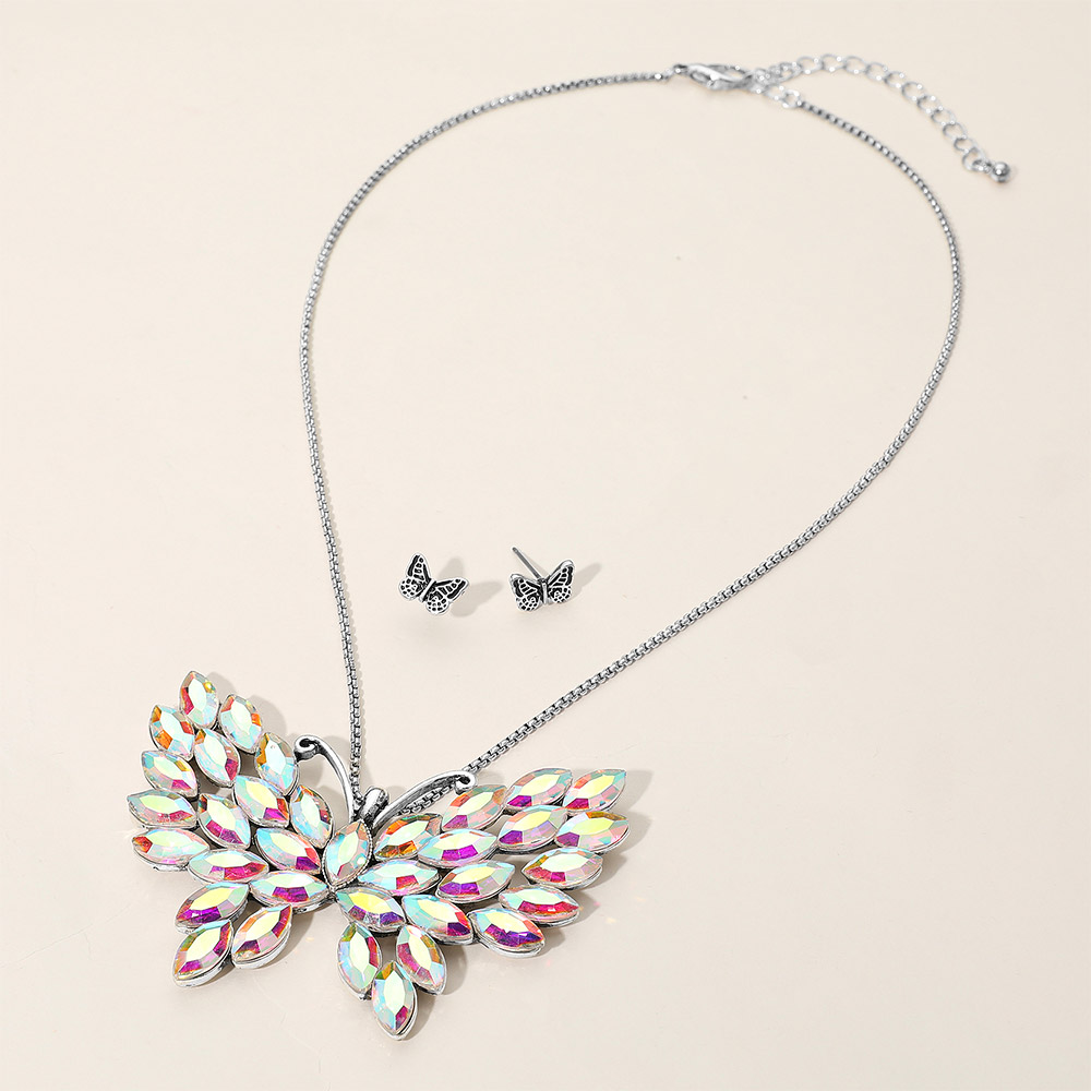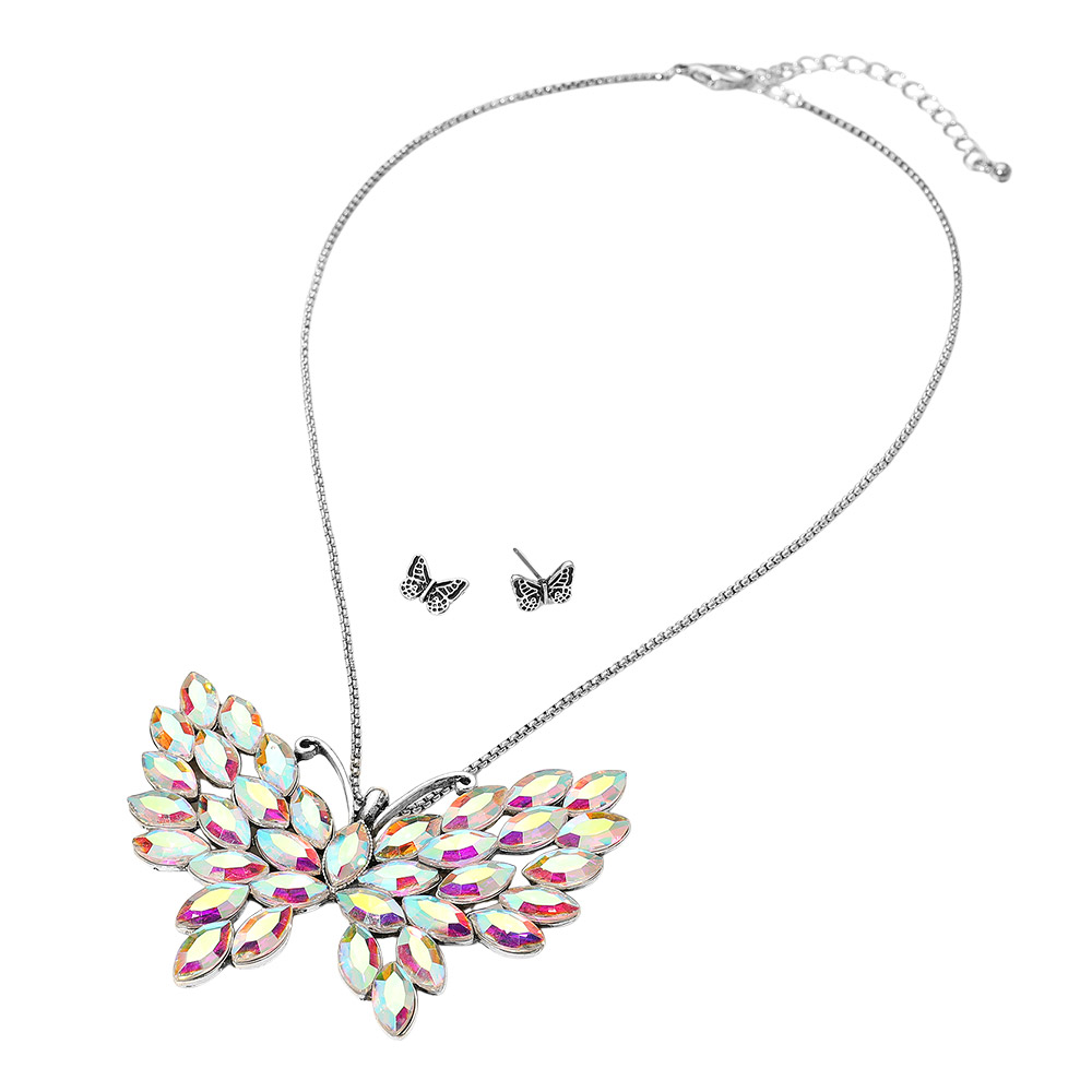 Details • Necklace Size : 18" + 3" L • Pendant Size : 3" X 2.2" • Earrings Size : 0.4" L • Elegant butterfly necklace and matching stud earrings with dazzling crystals. A delicate yet bold accessory that adds charm and sparkle to evening wear, parties, and special occasions. • Lead and Nickel Compliant