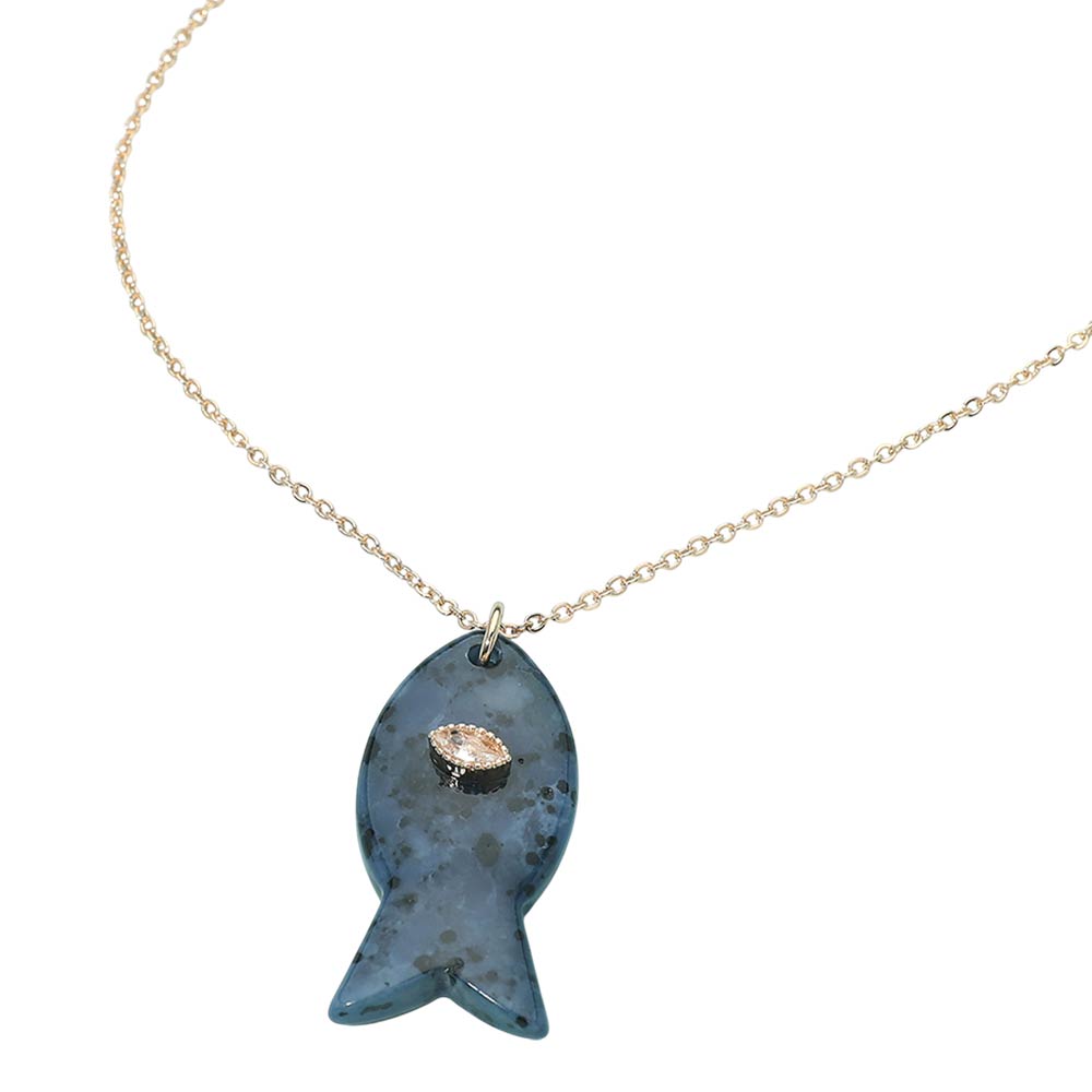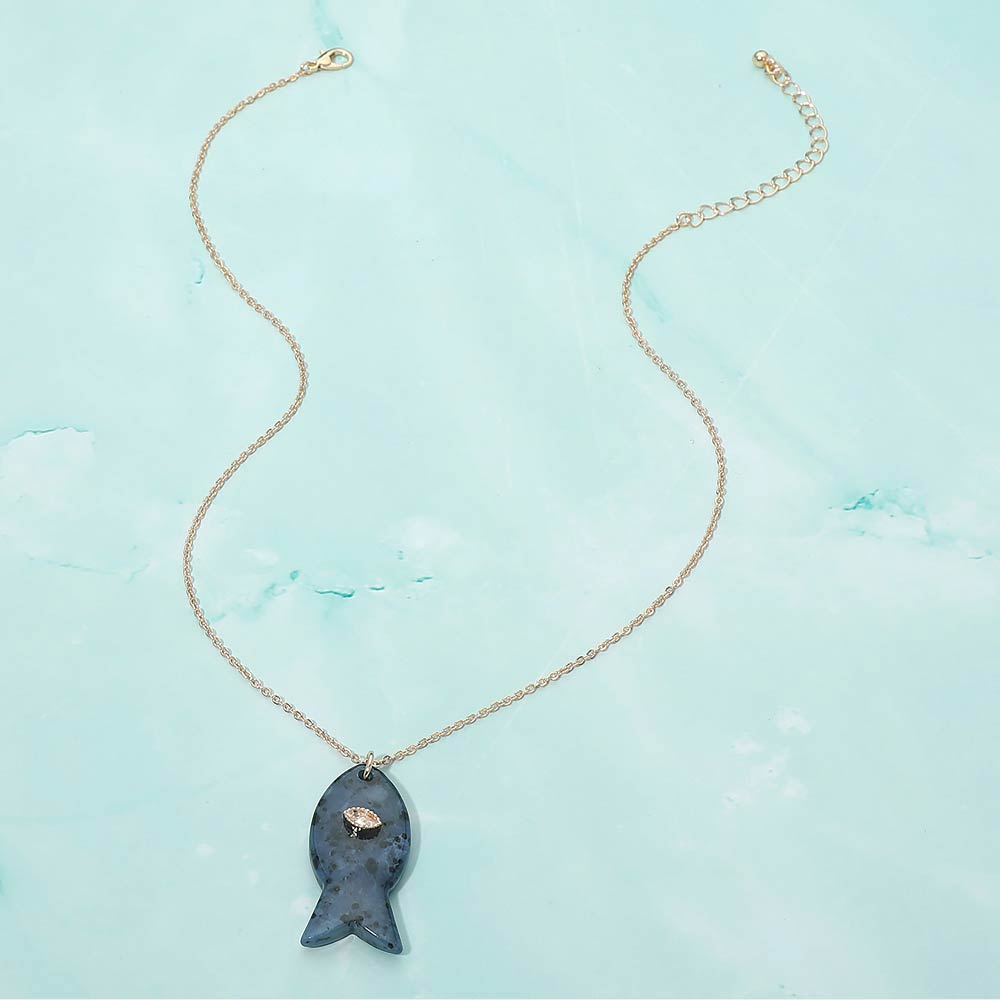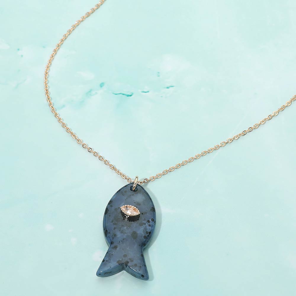• Unique fish pendant necklace featuring a smooth, sculpted charm accented with a small sparkling detail. Designed for everyday wear or easy layering, this ocean-inspired necklace brings a playful yet refined touch to casual outfits, resort looks, and gift-ready jewelry collections. A versatile accessory for beach, coastal, and nautical themed assortments.