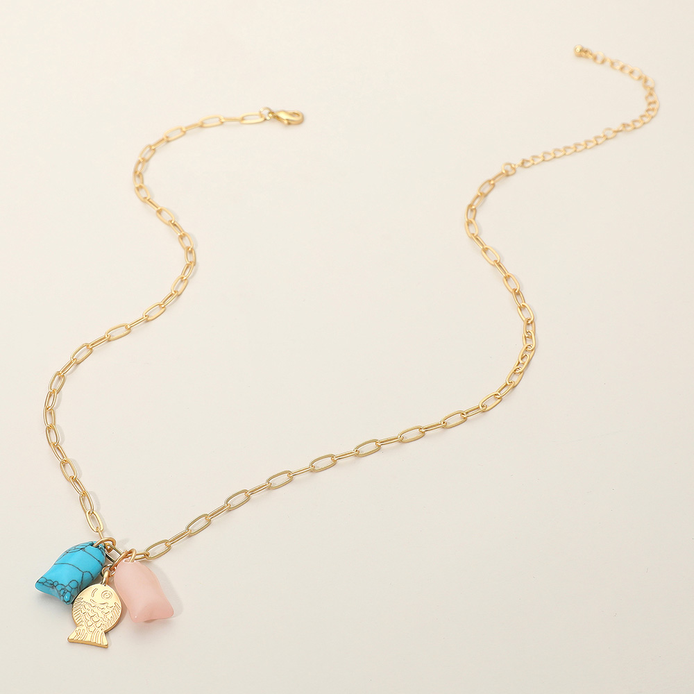 Details • Necklace Size : 16" + 3.5" L • Pendant Size : 1" L • Add a playful touch to your look with this charming pendant necklace featuring a delicate fish charm and colorful gemstone accents. Its bohemian-inspired design blends elegance with whimsy, making it a standout accessory for casual and chic styles. • Lead and Nickel Compliant