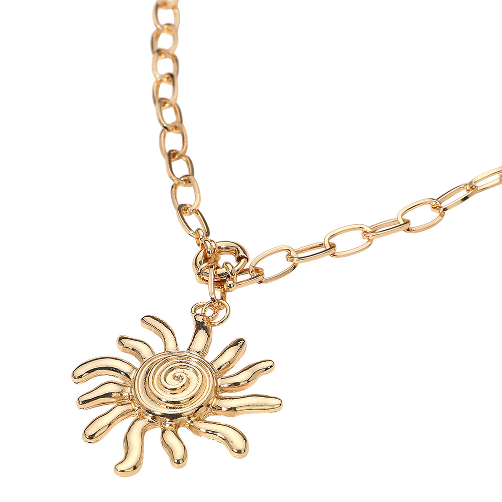 Details • Necklace Size : 16" + 0.5" L • Pendant Size : 1.6" X 2" • Add a touch of radiant charm with this spiral sun pendant chain necklace. Its unique sunburst design and bold link chain create a striking statement piece that captures warmth and vitality. Perfect for layering or wearing solo to elevate any look with effortless elegance. • Lead and Nickel Compliant