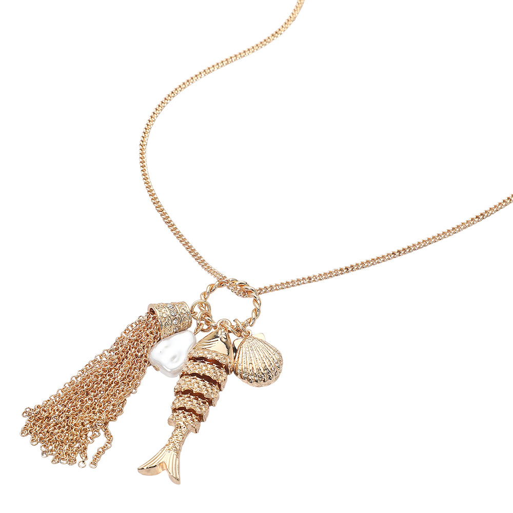 Details • Necklace Size : 23" + 3.25" L • Pendant Size : 3.25" L • This tassel charm pendant long chain necklace features a statement drop with layered charms and fluid fringe movement. Designed to elevate everyday outfits or boutique collections, it offers a bold yet elegant silhouette that works for gifting, seasonal styling, and trend-forward accessorizing. • Lead and Nickel Compliant
