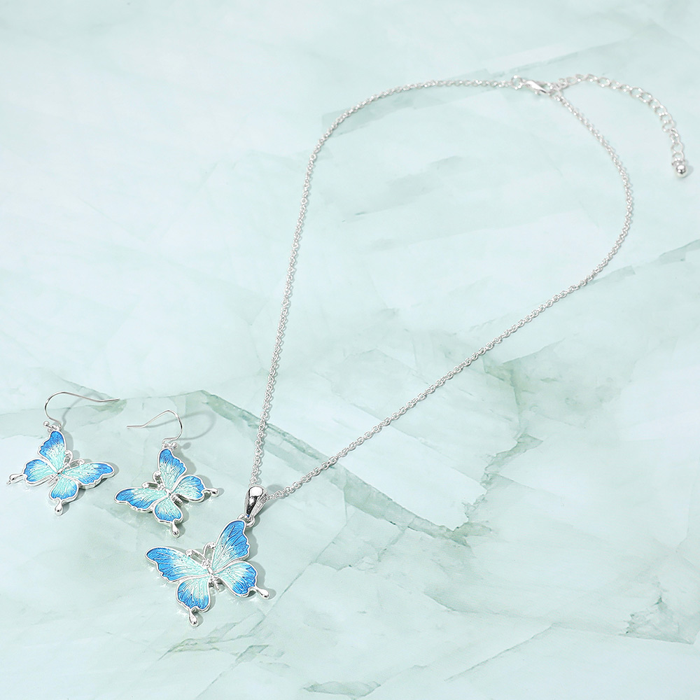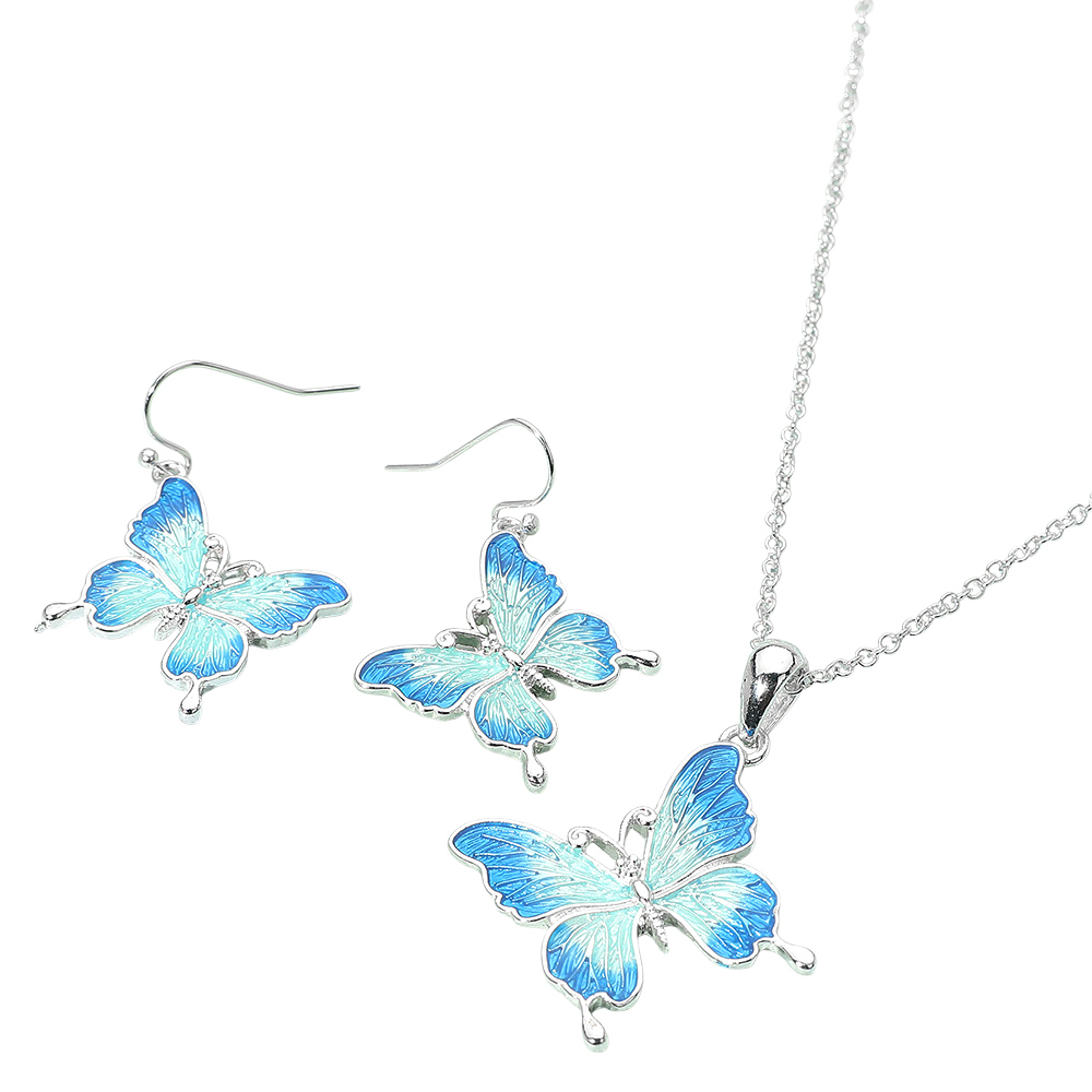 • This butterfly enamel necklace and earring set captures the beauty of transformation with its delicately detailed design. Perfectly coordinated for a polished look, it adds a touch of grace and charm to any outfit, making it ideal for both everyday wear and special occasions.