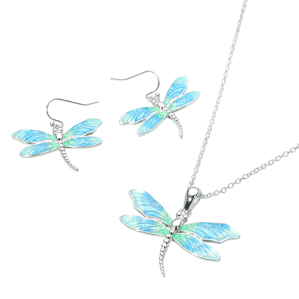 • This dragonfly enamel necklace and earring set embodies elegance and freedom with its detailed, nature-inspired design. The matching pieces create a harmonious look that enhances any outfit, offering a perfect balance of sophistication and artistic charm for all occasions.