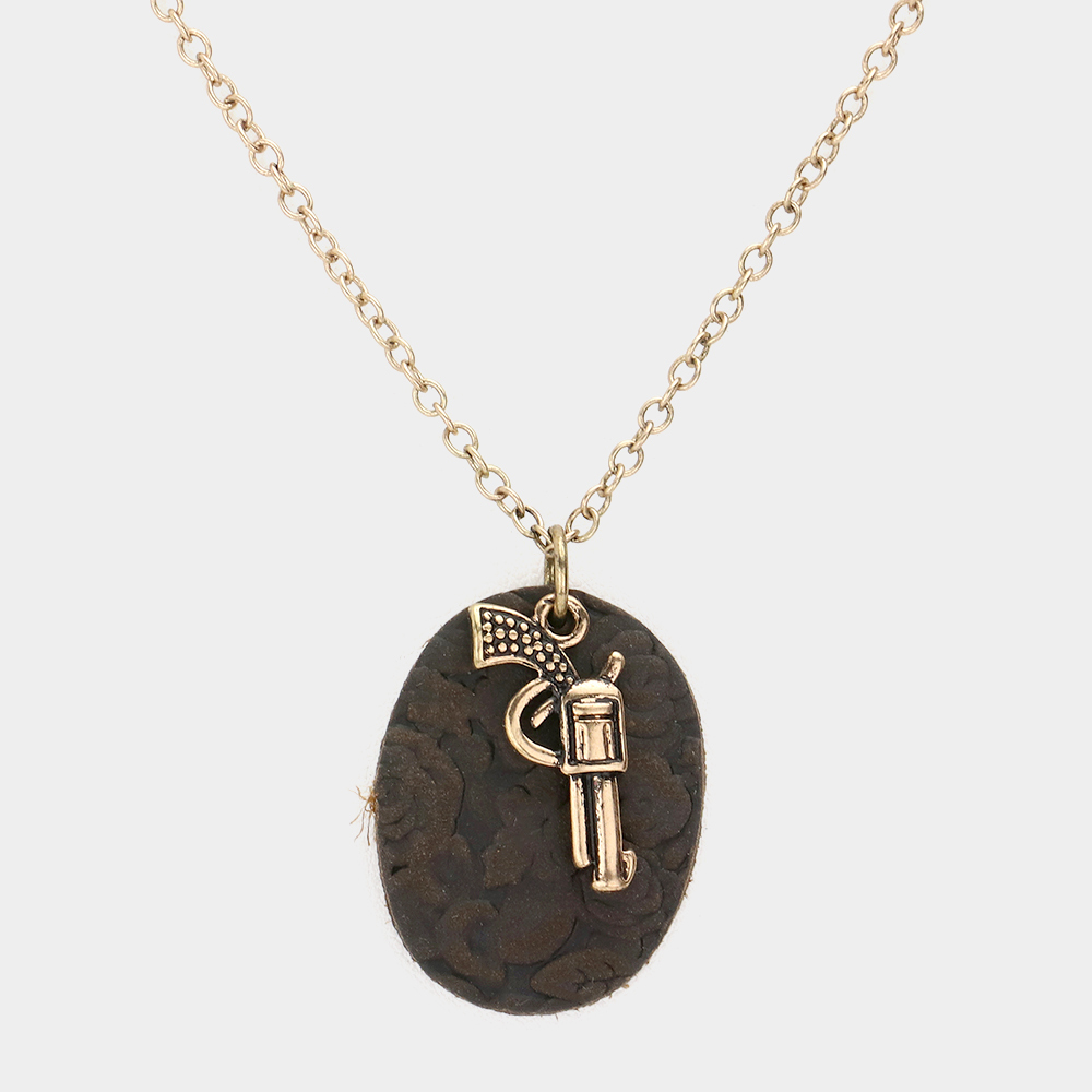 Oval Faux Leather Metal Gun Pendant Necklace