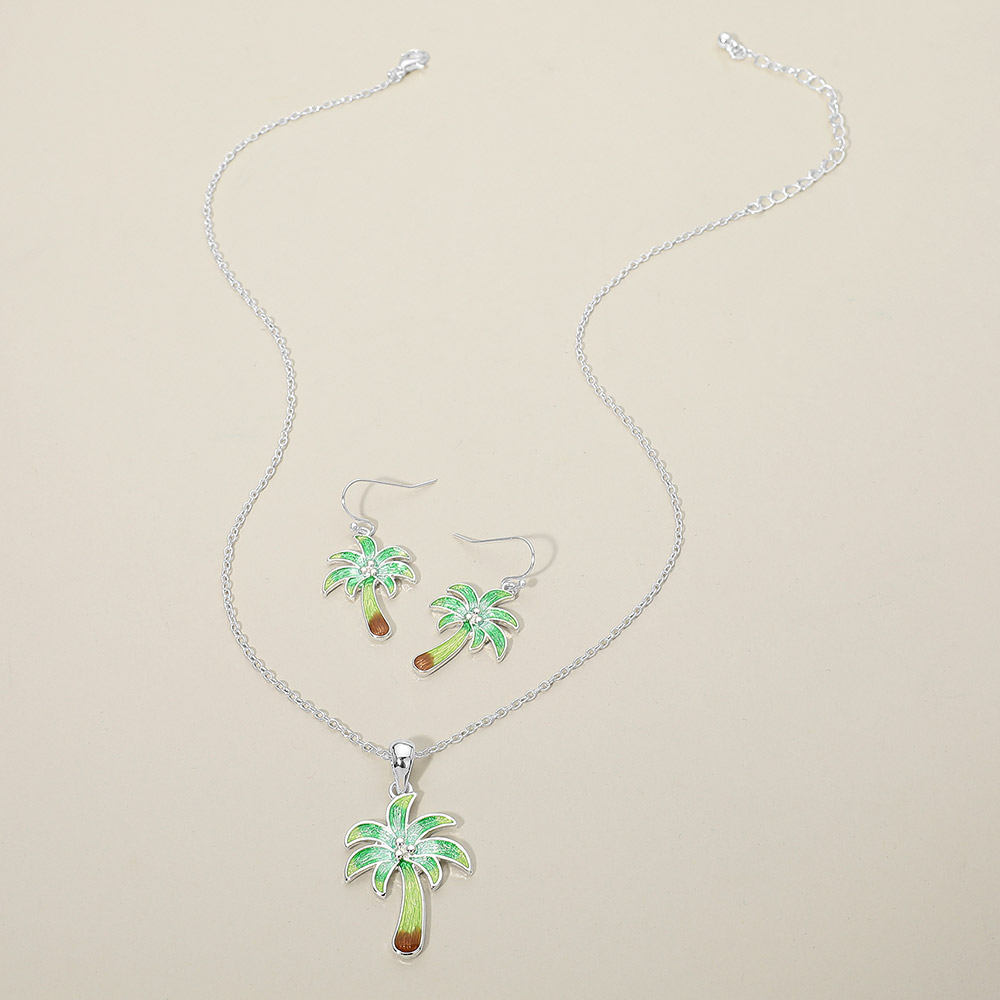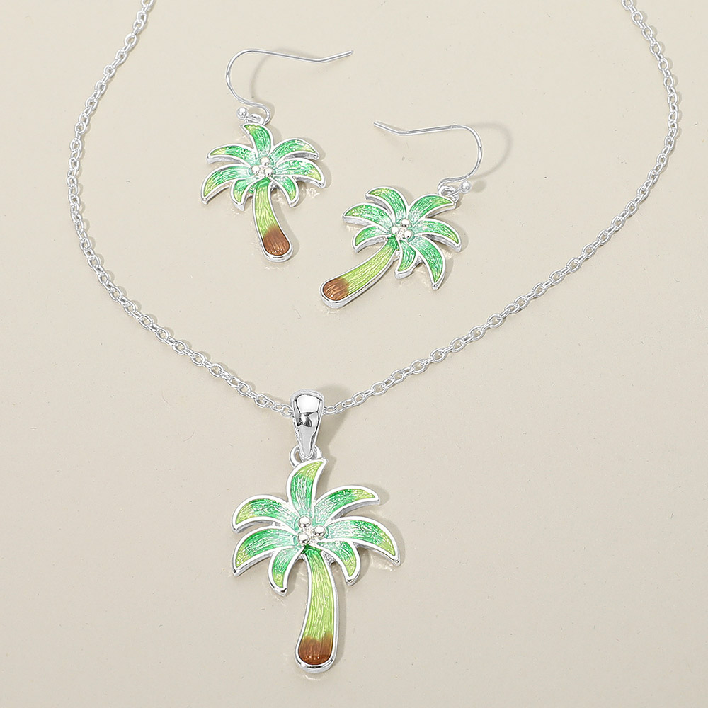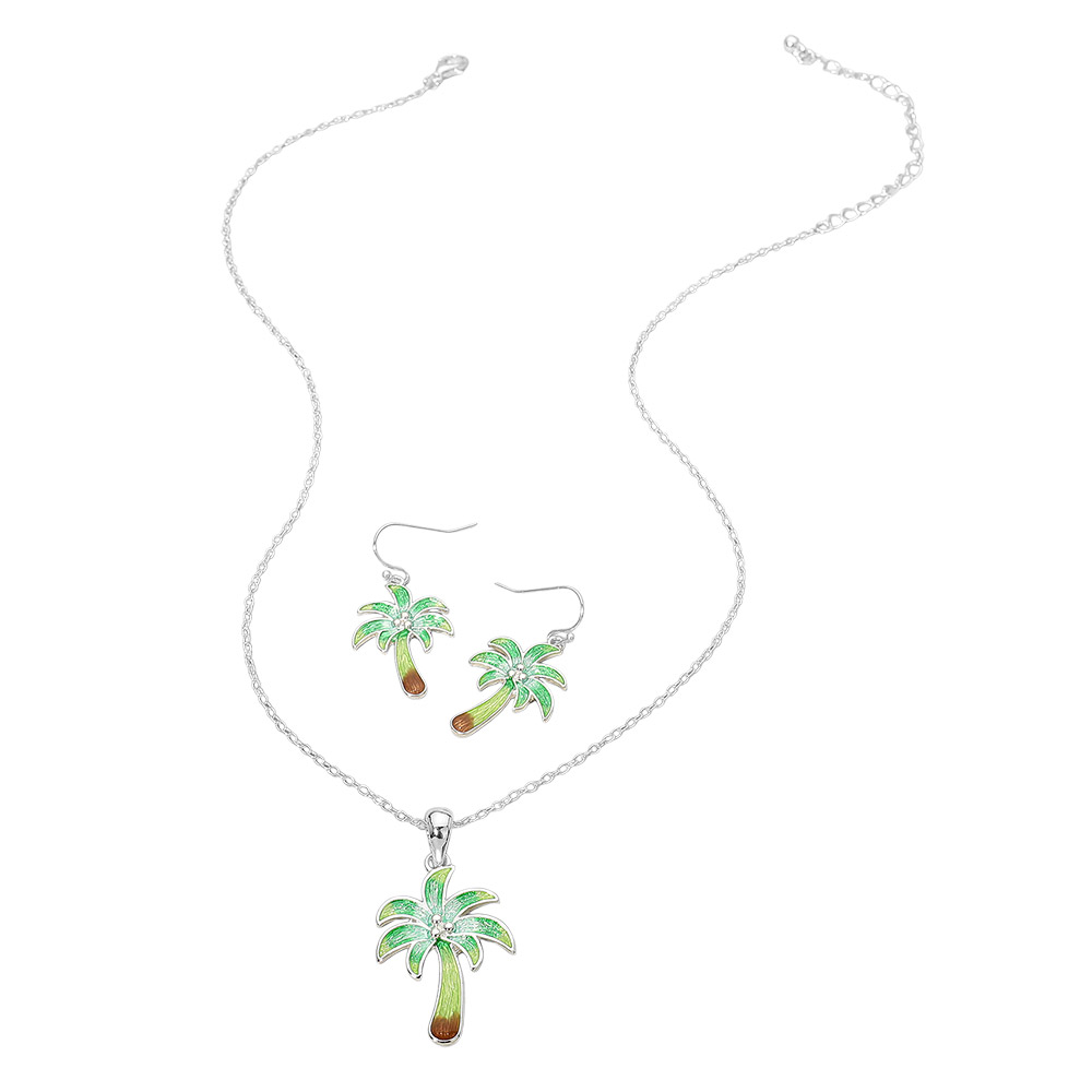Details • Necklace Size : 18" + 3" L • Pendant Size : 0.9" X 1.7" • Earrings Size : 1.5" L • Made in Vietnam • Palm tree pendant necklace and matching earring set featuring a tropical inspired design that brings a relaxed, vacation ready vibe to any look. Ideal for beach boutiques, resort shops, summer collections, and gift displays. This coordinated jewelry set appeals to customers seeking playful statement accessories, island themed styles, and easy to wear novelty jewelry for warm weather outfits. • Lead and Nickel Compliant