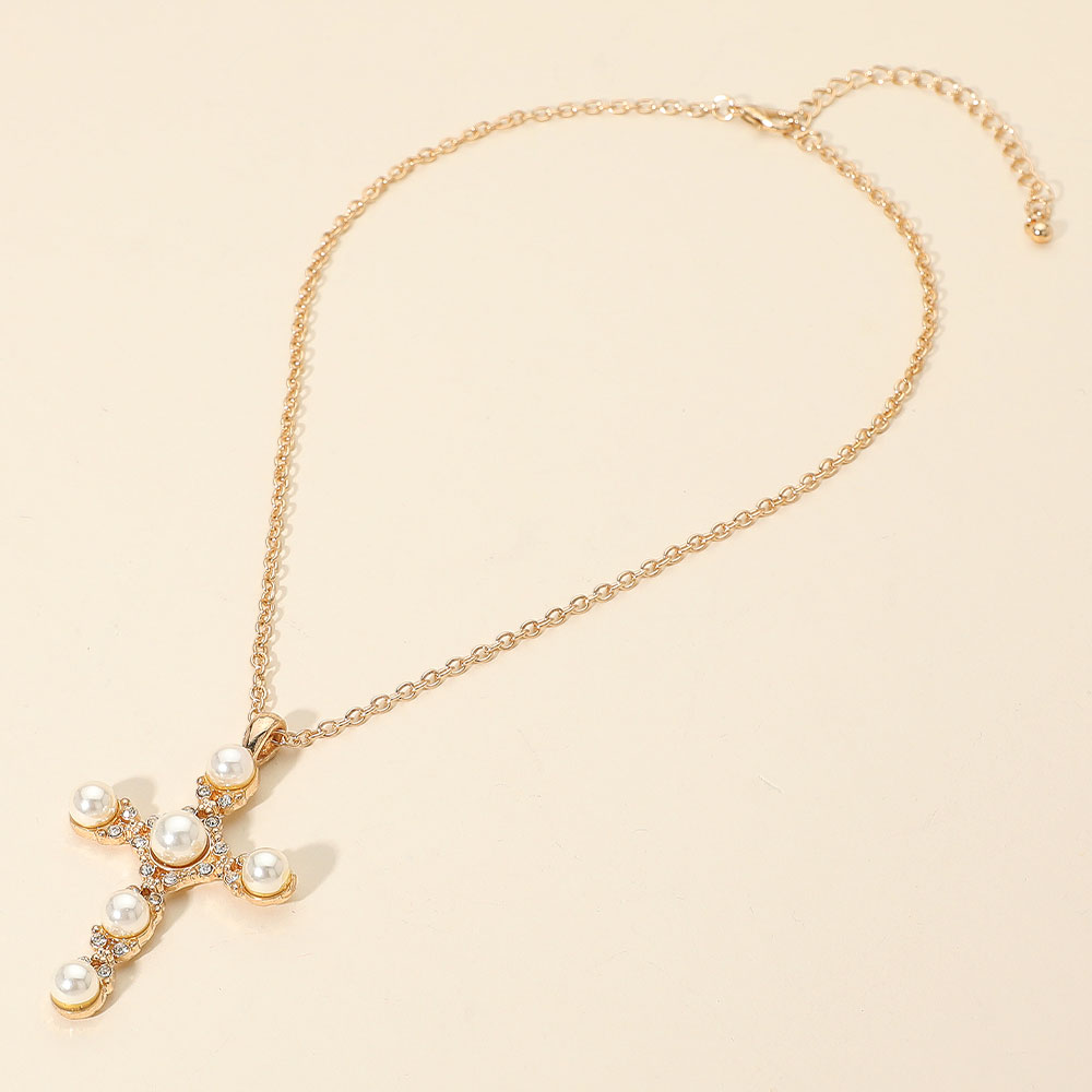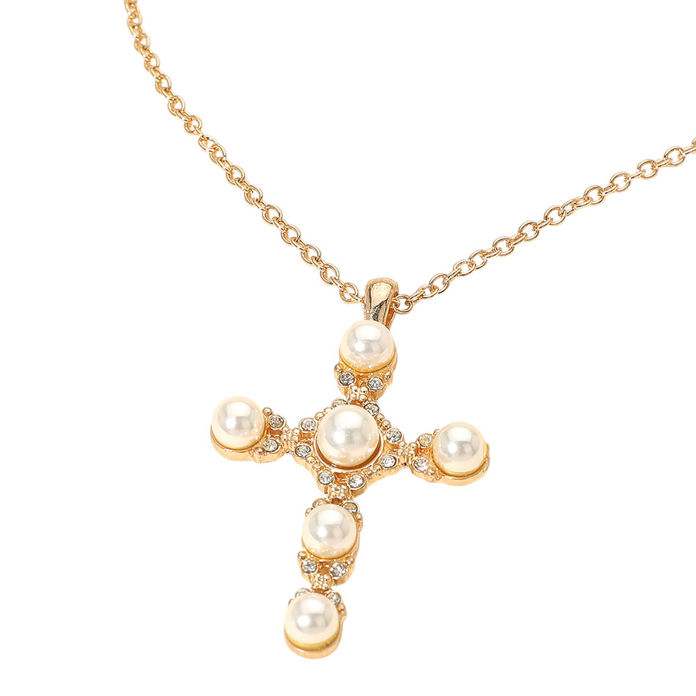 Details • Necklace Size : 16" + 3.5" L • Pendant Size : 1.5" X 2.25" • Chic cross pendant necklace featuring smooth pearl accents and sparkling details on a refined chain. Offers a timeless, graceful look perfect for daily wear or special occasions. A stylish, meaningful accessory that enhances any outfit. • Lead and Nickel Compliant