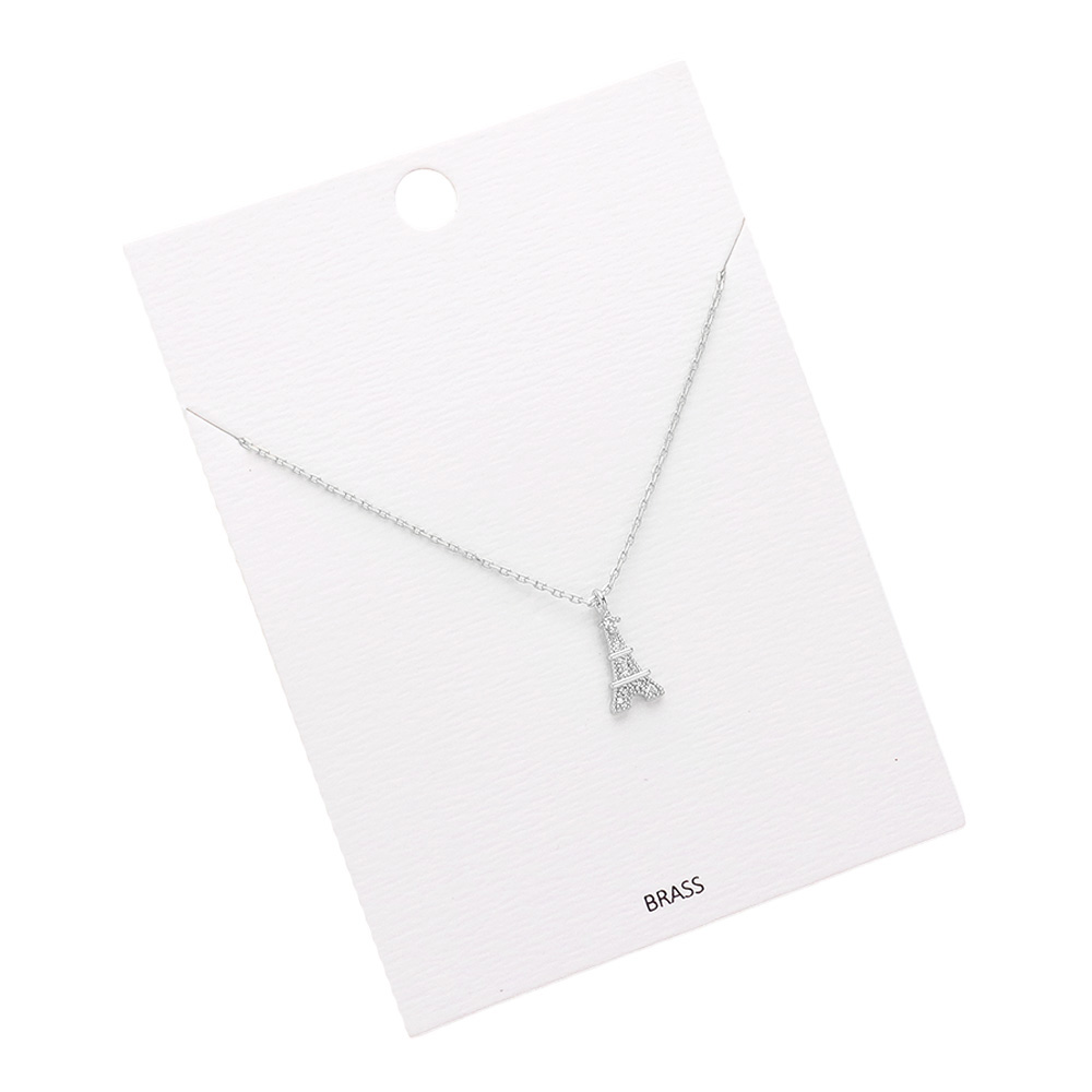 Details • Necklace Size : 16" + 3" L • Pendant Size : 0.25" X 0.5" • Elegant necklace featuring a petite Eiffel Tower pendant accented with delicate crystal details. Set on a fine chain, this charming piece adds a subtle Parisian flair to your style. Perfect for everyday wear or gifting to someone who loves travel and timeless elegance. • Brass