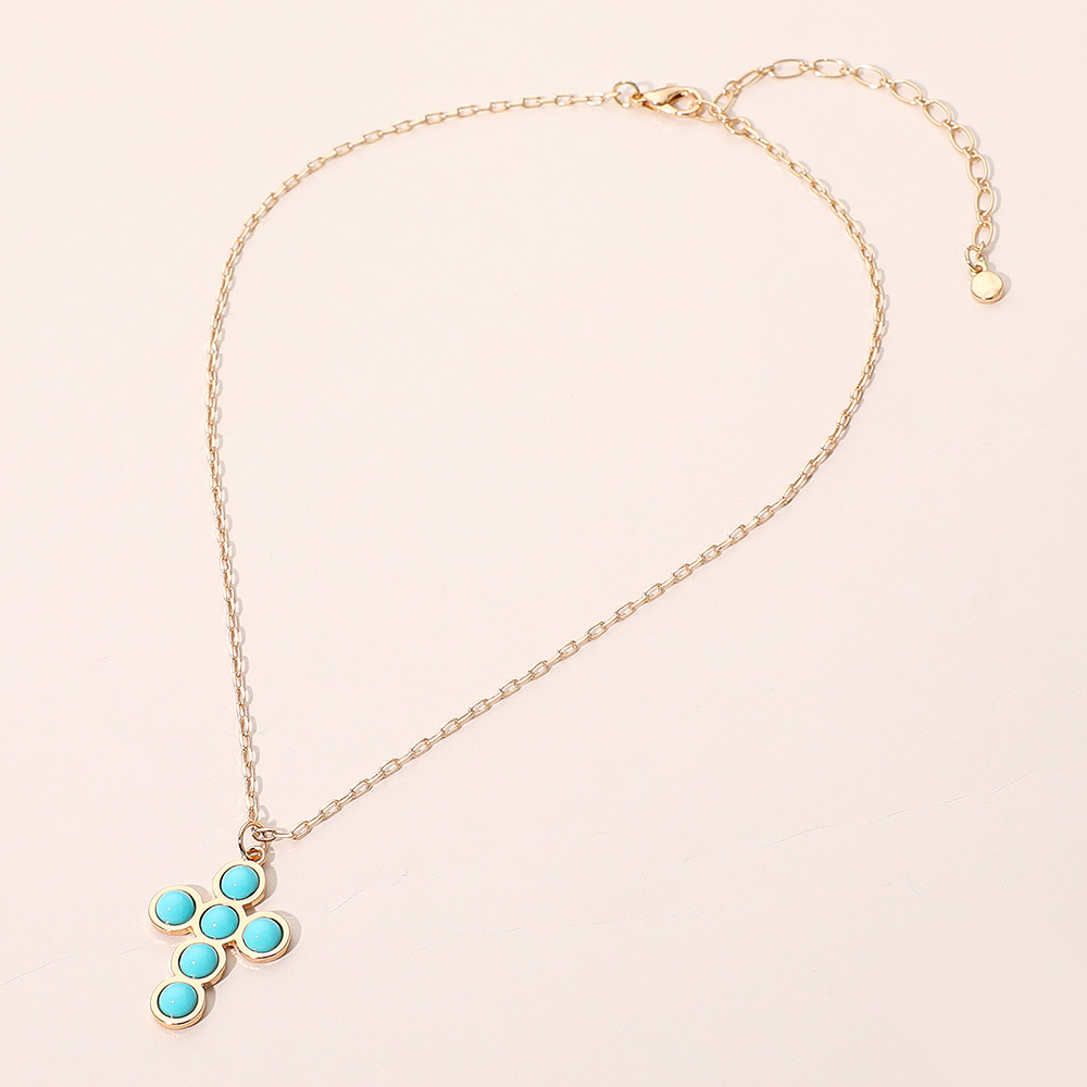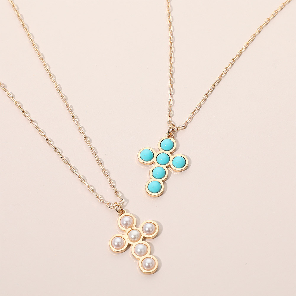• Chic cross pendant necklace featuring smooth round stone accents set on a fine link chain. Elegant and versatile, this modern accessory adds a subtle touch of style and symbolism to both everyday outfits and special occasion looks.
