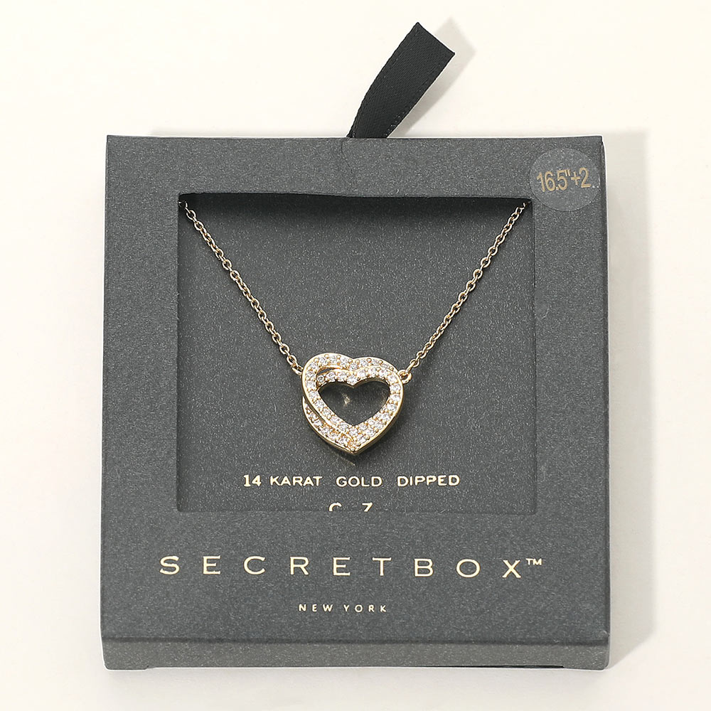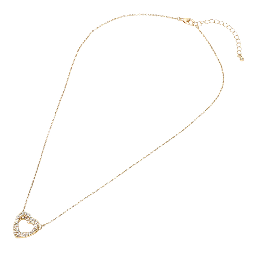 Details • Necklace Size : 16.5" + 2" L • Pendant Size : 0.6" X 0.6" • This heart CZ pendant necklace features a timeless open-heart design accented with sparkling stones for an elegant, gift-ready look. Perfect for everyday wear, special occasions, or boutique displays, it offers classic appeal that works beautifully for romantic gifting, seasonal promotions, and curated jewelry collections. • CZ Cubic Zirconia • Gold Dipped