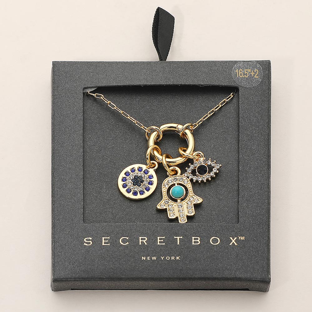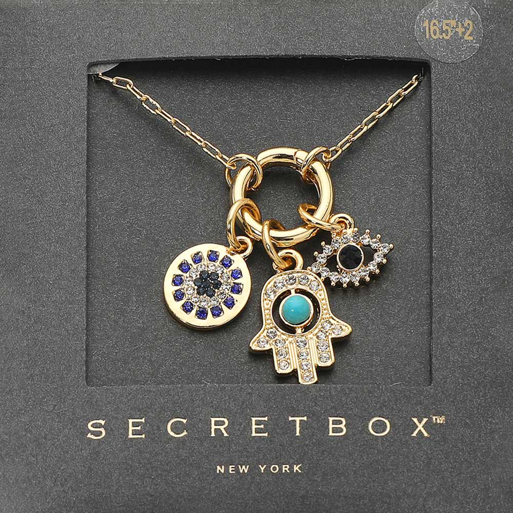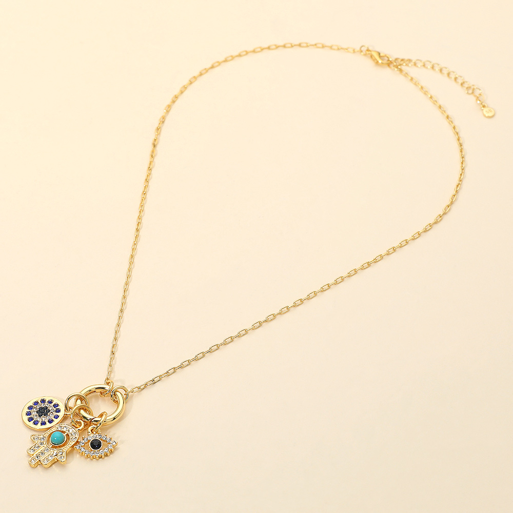 Details • Necklace Size : 16.5" + 2" L • Pendant Size : 1.25" X 1" • A striking multi-charm necklace featuring a protective hand, an eye motif, and a round charm with sparkling accents. The layered symbolic design adds personality and meaning, making it perfect for daily wear, gifting, or styling as a standout statement piece. • Gold Dipped