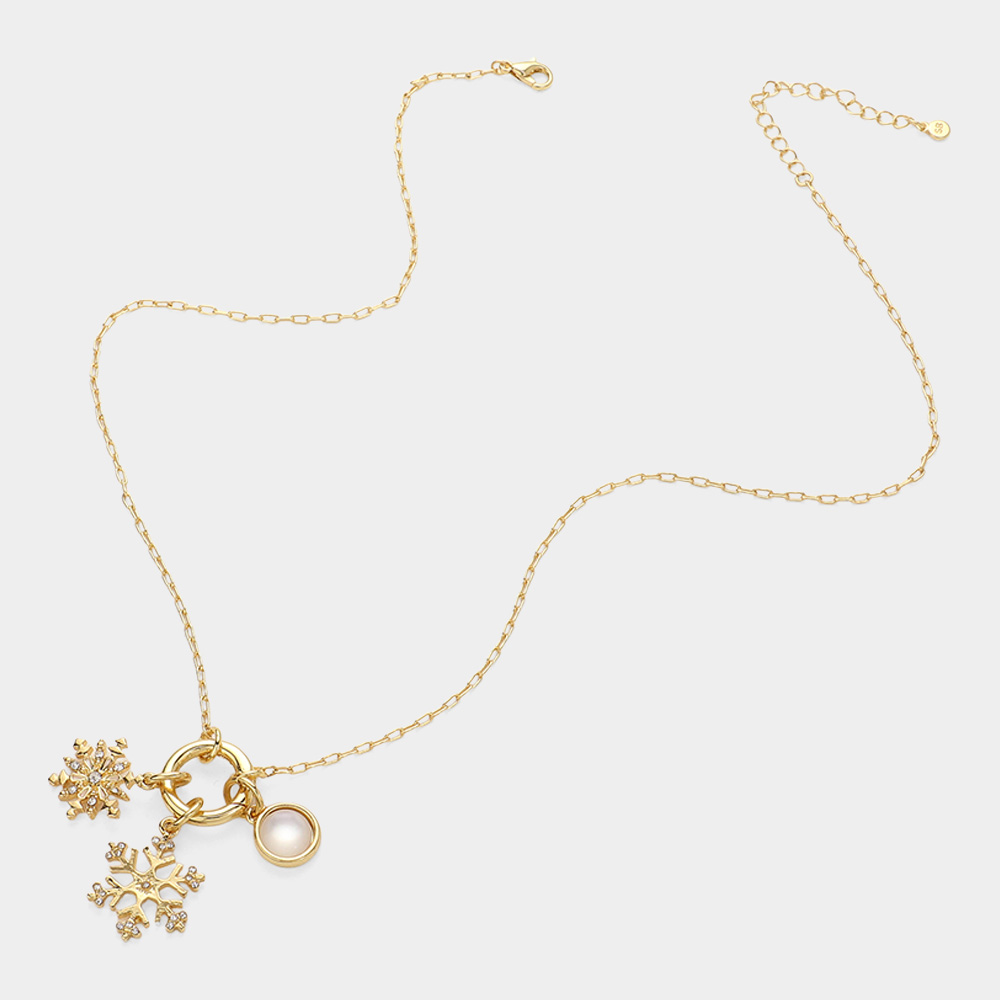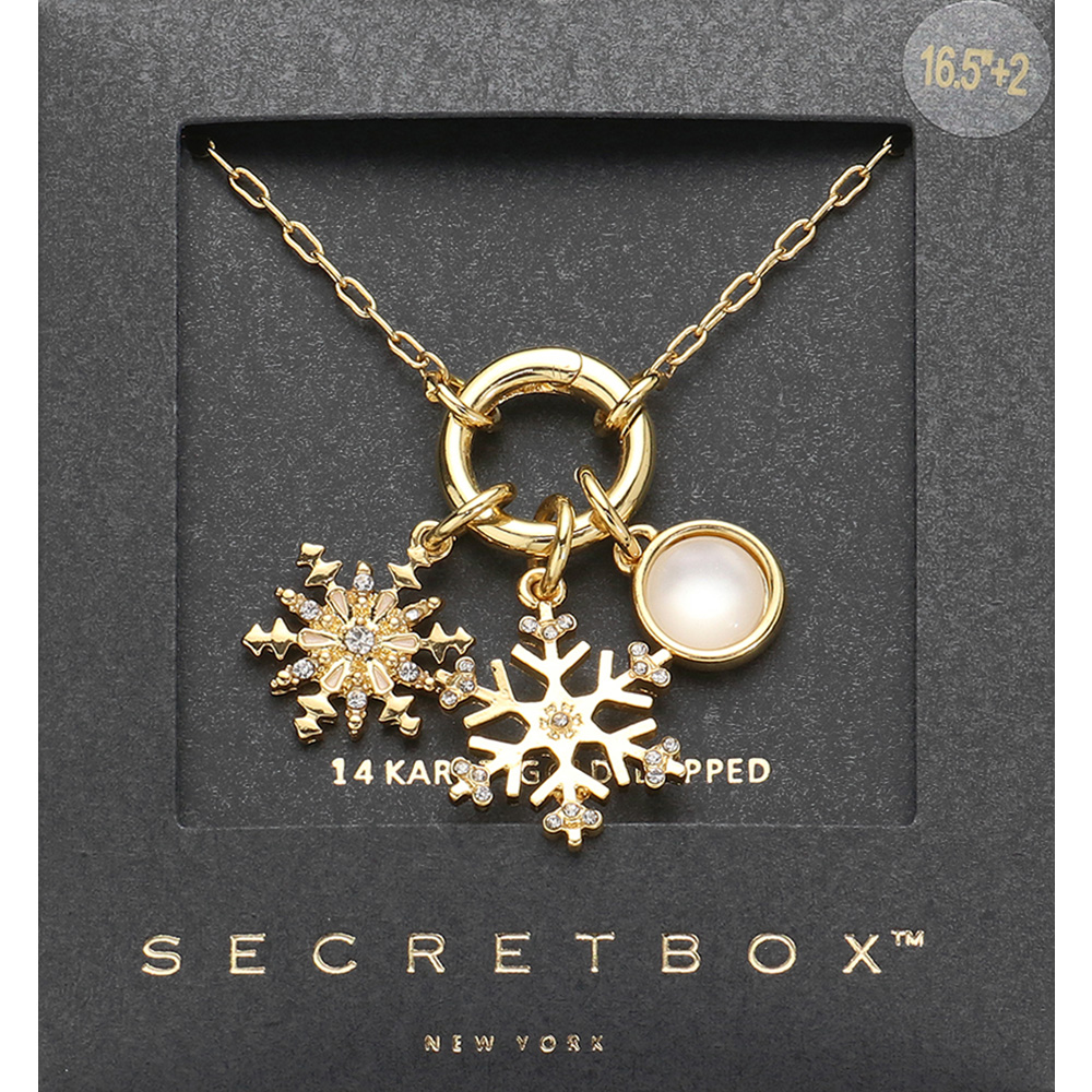 SECRET BOX_14K Gold Dipped Stone Paved Double Snowflake Pearl Pendant Necklace