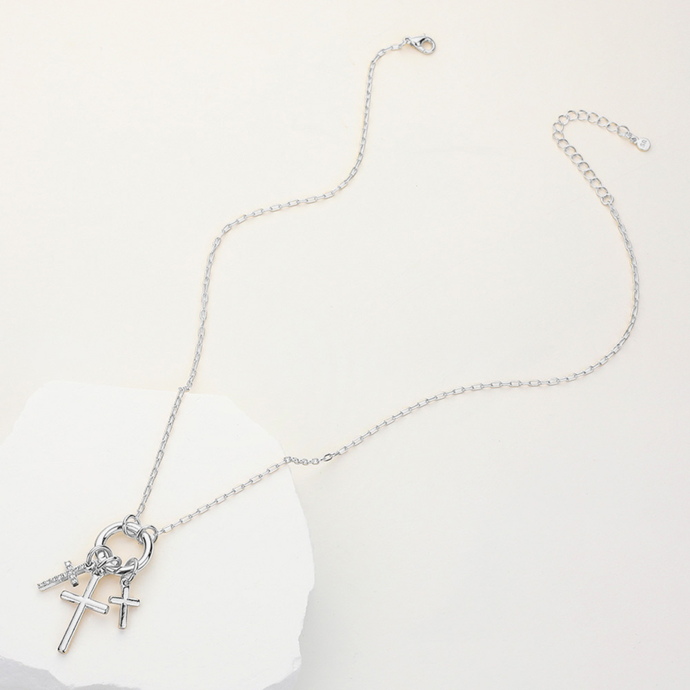 • A striking necklace featuring three cross pendants in varied sizes and finishes, creating a layered, meaningful statement. The bold charm cluster adds dimension and style, making it perfect for daily wear, gifting, or pairing with other pieces for a standout modern look.