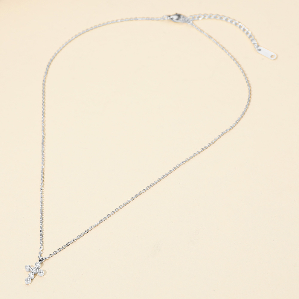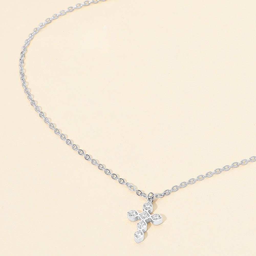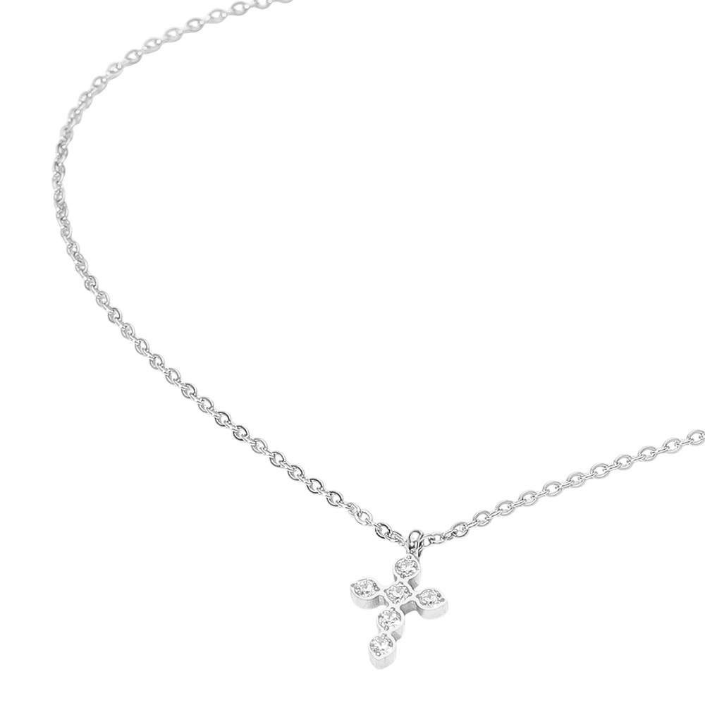 Details • Necklace Size : 16.5" + 2" L • Pendant Size : 0.4" X 0.6" • Water Resistant • Elegant cross pendant necklace featuring a delicate chain and shimmering details. A timeless accessory that adds a subtle yet meaningful touch of shine to any outfit, perfect for layering or wearing alone for a classic, refined look suitable for any occasion. • Hypoallergenic • Stainless Steel