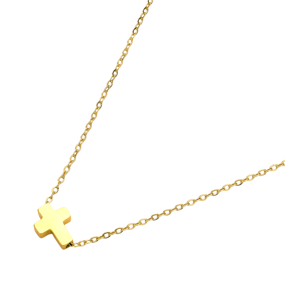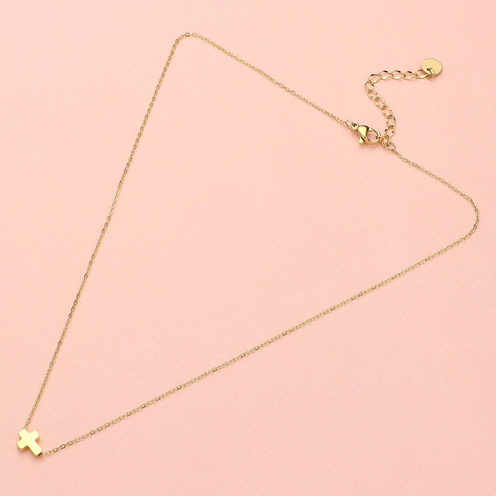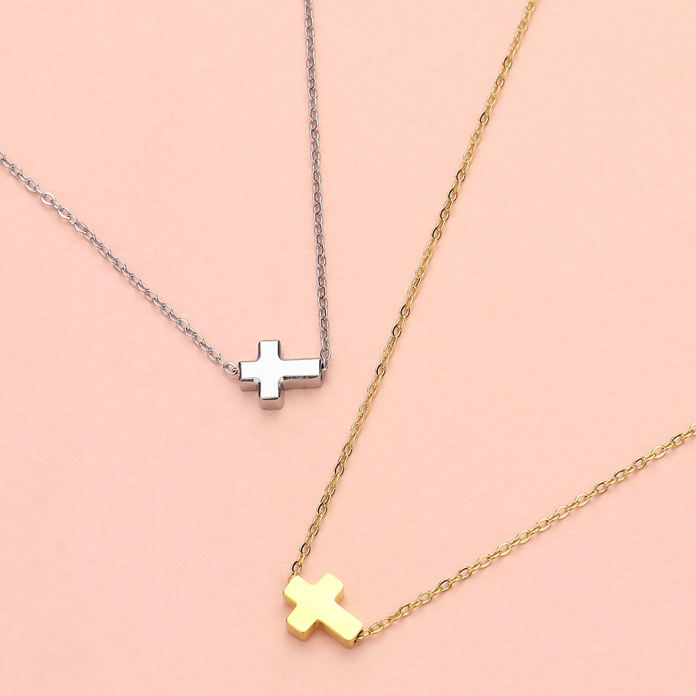 Details • Necklace Size : 16" + 2" L • Pendant Size : 0.3" X 0.3" • Water Resistance • Refined and versatile, this minimalist cross pendant necklace is designed with a sleek chain and polished cross charm. A timeless accessory that pairs effortlessly with casual and formal styles, making it a meaningful addition to any jewelry collection. • Hypoallergenic • Stainless Steel