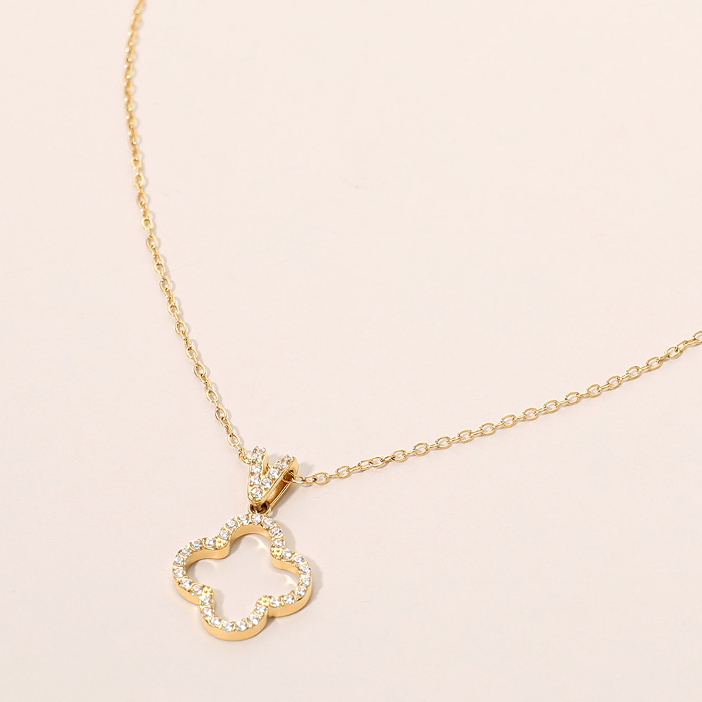 SECRET BOX_Stainless Steel Stone Paved Open Quatrefoil Pendant Necklace