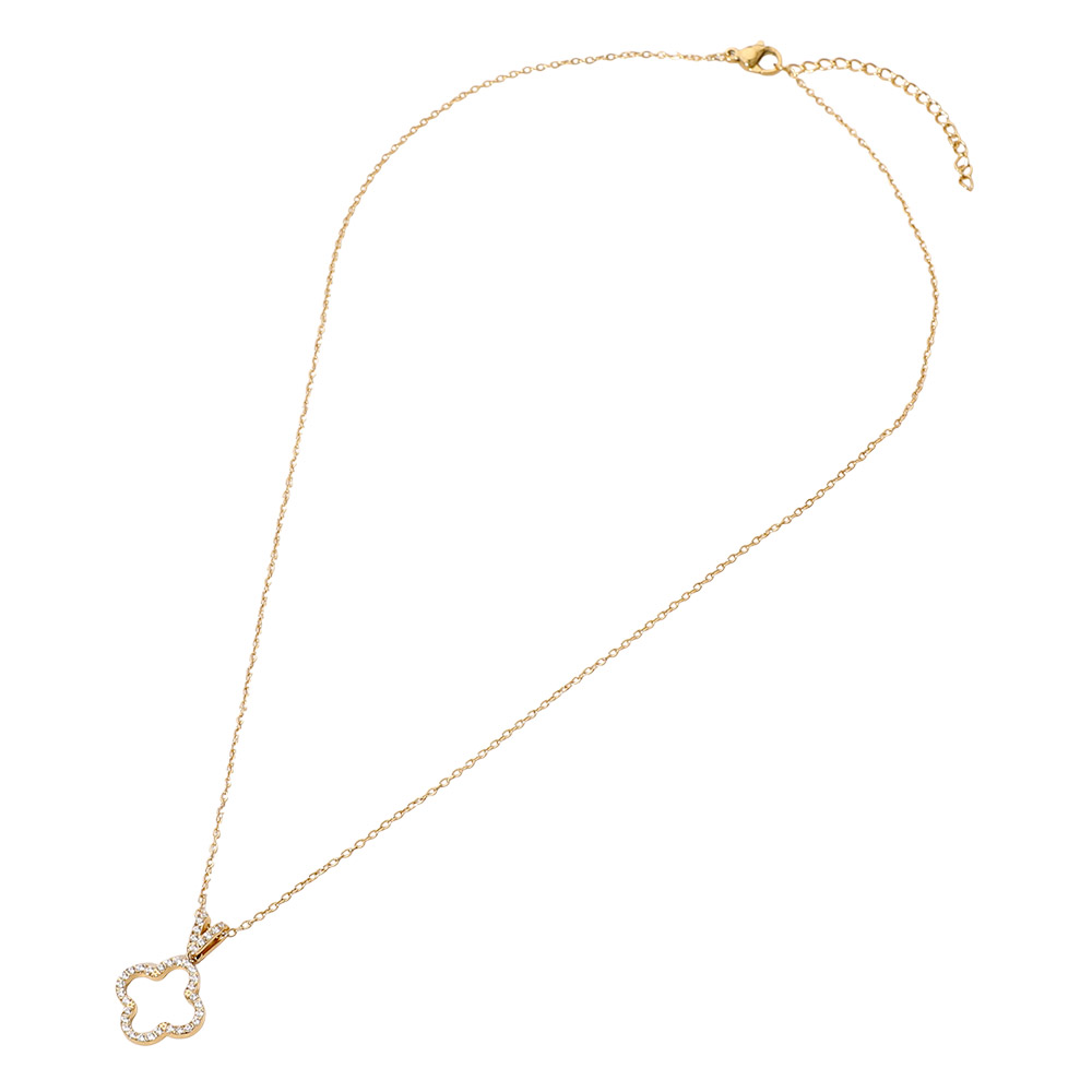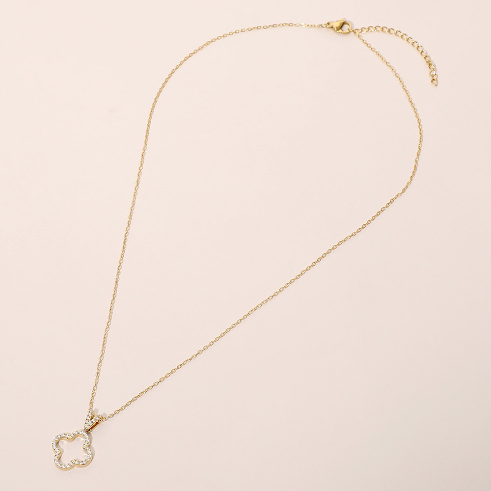 Details • Necklace Size : 17" + 2" L • Pendant Size : 0.6" X 0.8" • Delicate quatrefoil outline pendant necklace designed with subtle sparkle for an elegant everyday look. This lightweight necklace layers effortlessly with other styles or shines on its own, making it a versatile, gift-ready accessory ideal for boutiques and trend-focused jewelry collections. • Hypoallergenic • Stainless Steel