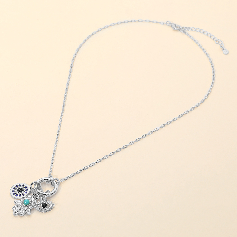 • A striking multi-charm necklace featuring a protective hand, an eye motif, and a round charm with sparkling accents. The layered symbolic design adds personality and meaning, making it perfect for daily wear, gifting, or styling as a standout statement piece.