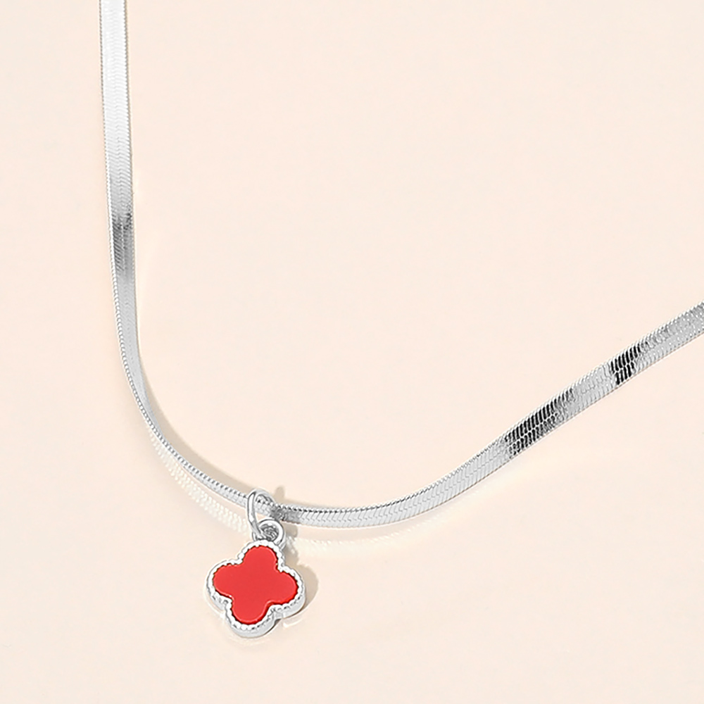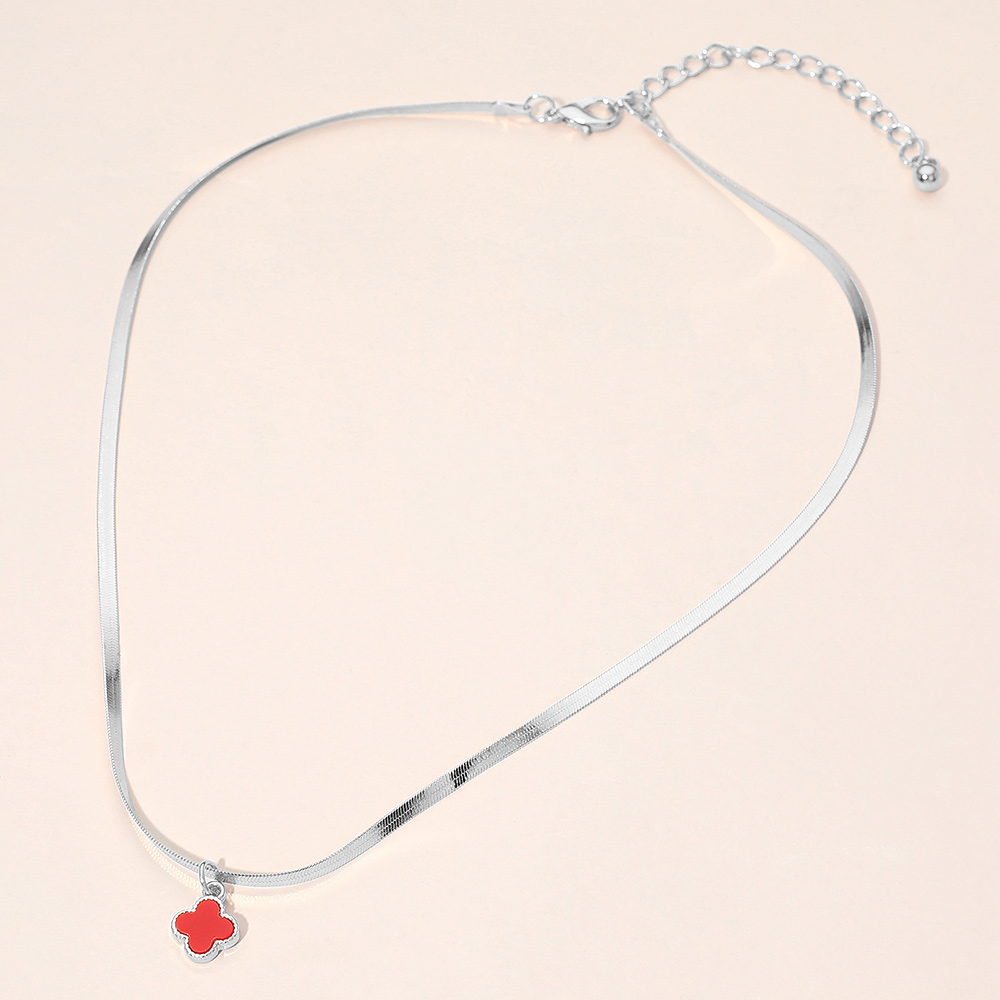 Details • Necklace Size : 18" + 3.25" L • Pendant Size : 0.4" X 0.5" • This minimalist flat chain necklace features a delicate quatrefoil shaped pendant with a sleek silhouette and adjustable length for easy styling. Designed for everyday wear, it layers effortlessly with other necklaces and adds a clean, modern accent to casual looks, work outfits, or gift ready accessory collections for boutiques and online shops. • Lead and Nickel Compliant • Sterling Silver Dipped