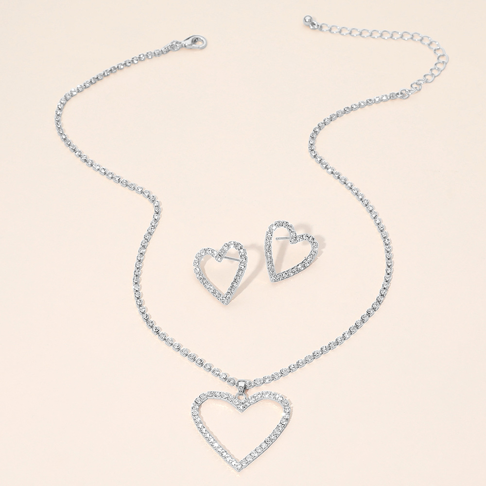 Details • Necklace Size : 16" + 3.25" L • Pendant Size : 1.25" X 1.25" • Earrings Size : 0.8" L • This elegant jewelry set features a heart shaped pendant necklace paired with matching heart stud earrings for a coordinated, timeless look. Designed to add sparkle and charm to everyday outfits or special occasions, it’s perfect for gifting, Valentine themed collections, or romantic boutique displays. Ideal for layering or wearing as a complete matching set. • Lead and Nickel Compliant • Sterling Silver Dipped