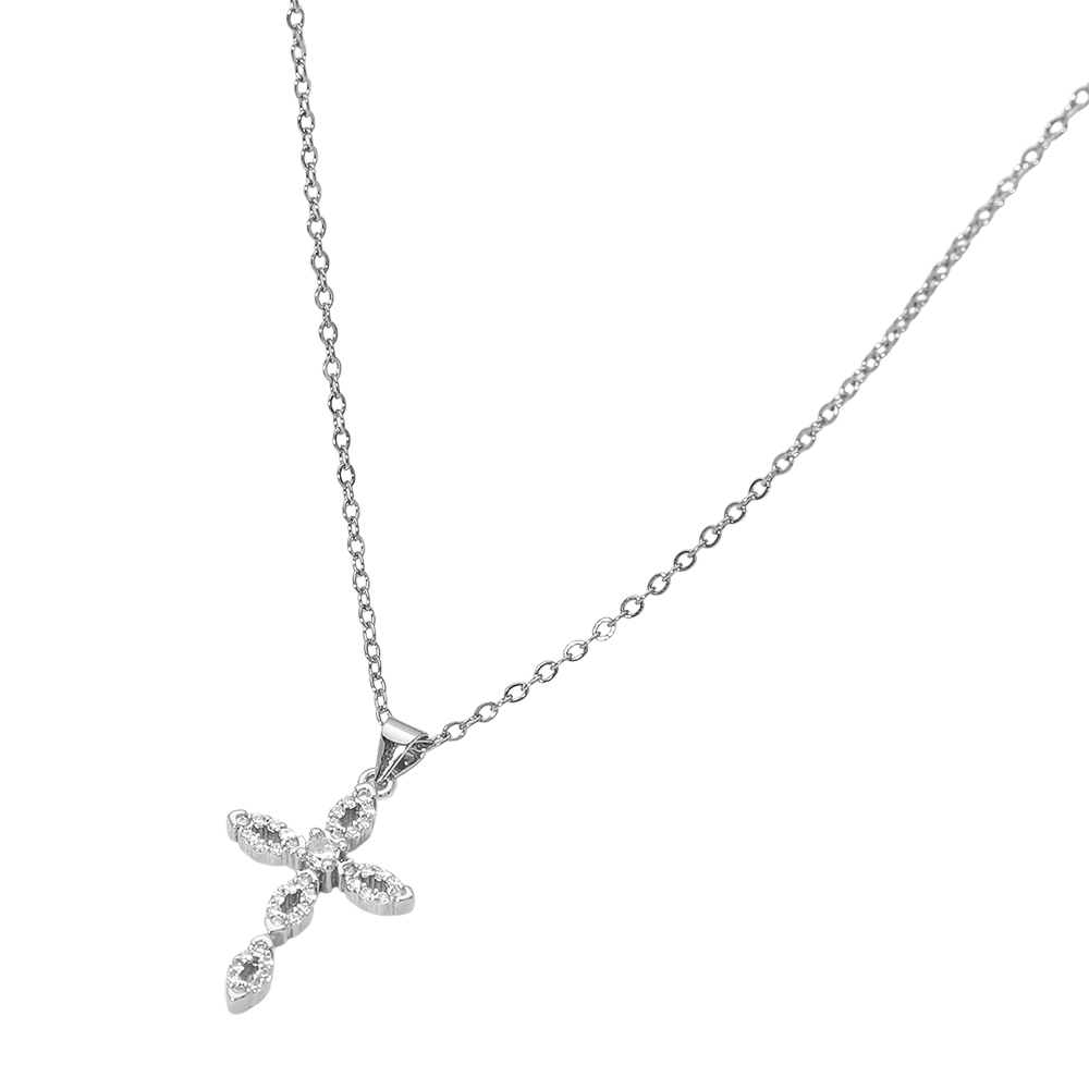 Details • Necklace Size : 15.5" + 2.25" L • Pendant Size : 0.7" X 1.25" • This CZ cross pendant chain necklace features a delicately detailed cross charm accented with shimmering stones for a timeless and meaningful look. Designed for effortless everyday wear or layered styling, it offers elegant symbolism and versatile appeal ideal for gifting, boutiques, and curated jewelry collections. • CZ Cubic Zirconia • Stainless Steel