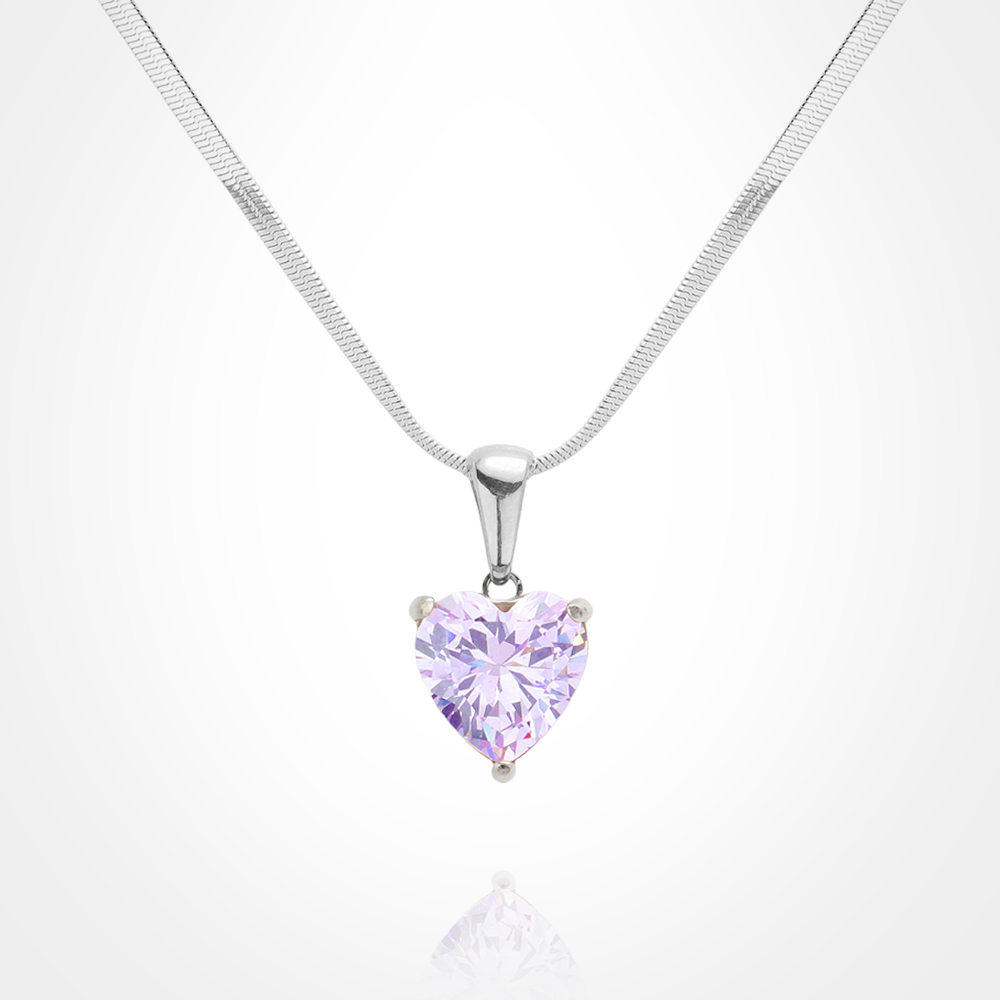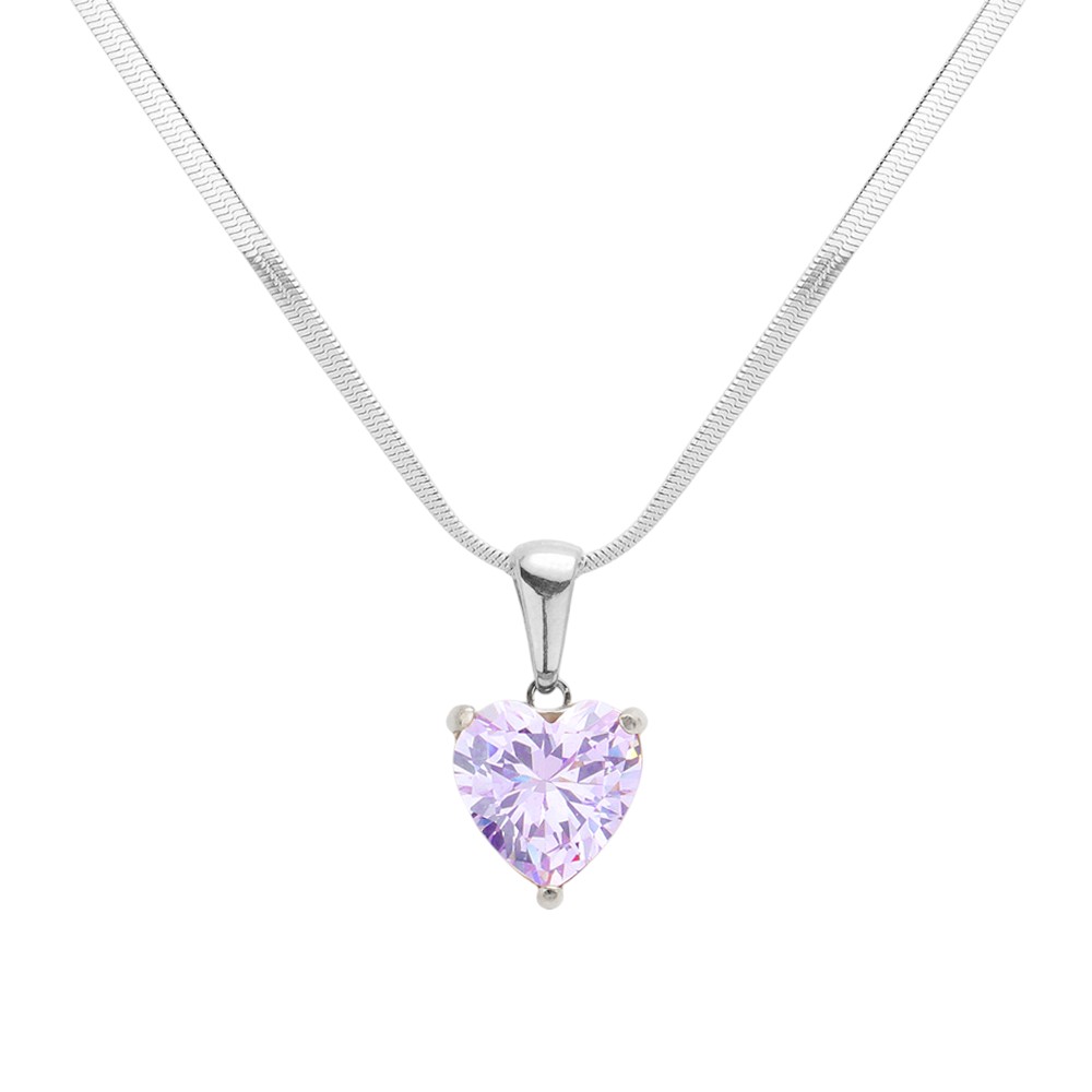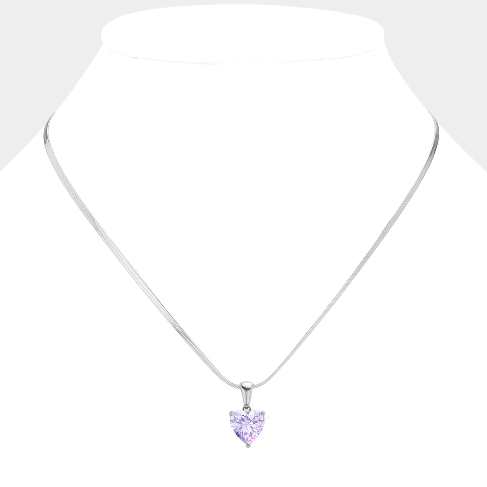 Details • Necklace Size : 16" + 2" L • Pendant Size : 0.4" X 0.75" • This elegant necklace showcases a heart-cut lavender CZ pendant suspended from a sleek stainless steel chain for a refined, romantic touch. Its minimalist design makes it perfect for both everyday wear and special occasions, adding a subtle sparkle and feminine charm to any outfit effortlessly. • CZ Cubic Zirconia • Stainless Steel