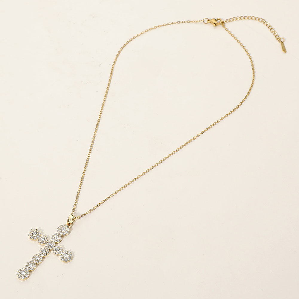 Details • Necklace Size : 15.5" + 2" L • Pendant Size : 1.1" X 1.75" • Timeless CZ cross pendant necklace designed for everyday wear and meaningful gifting. Features a refined cross charm with delicate detailing on a classic chain, perfect for layering or solo styling. Ideal for faith-inspired collections, boutique displays, and customers seeking symbolic jewelry with elegant, versatile appeal for daily outfits or special occasions. • CZ Cubic Zirconia • Stainless Steel