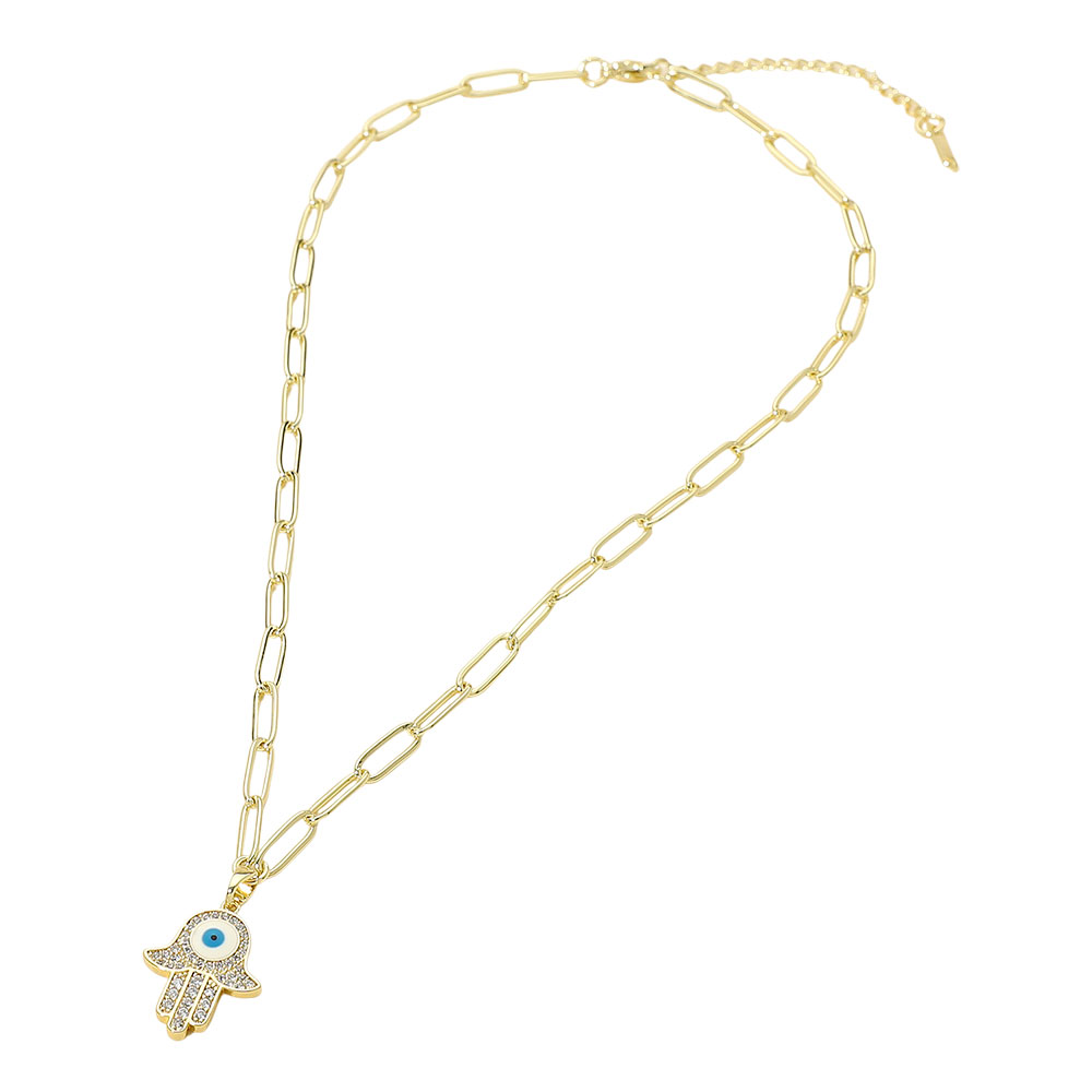 Stainless Steel CZ Stone Paved Evil Eye Hamsa Hand Pendant Paperclip Chain Necklace