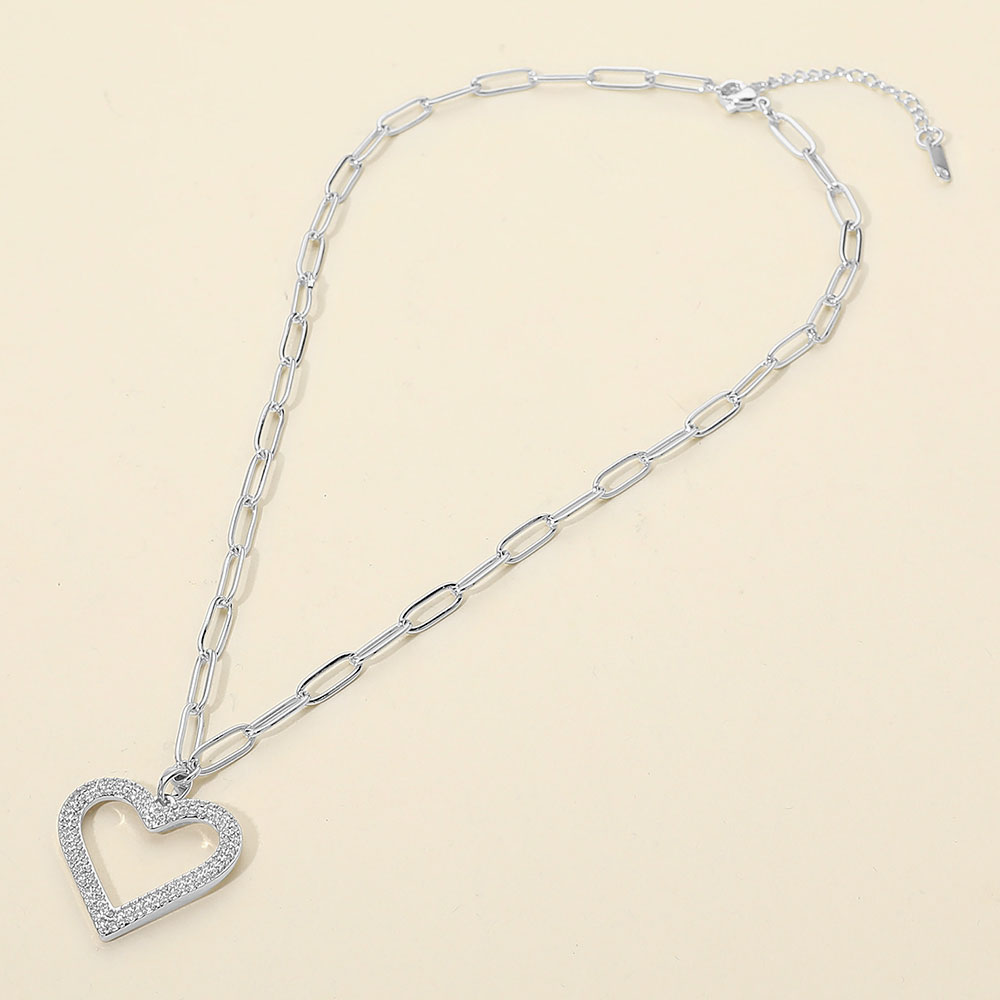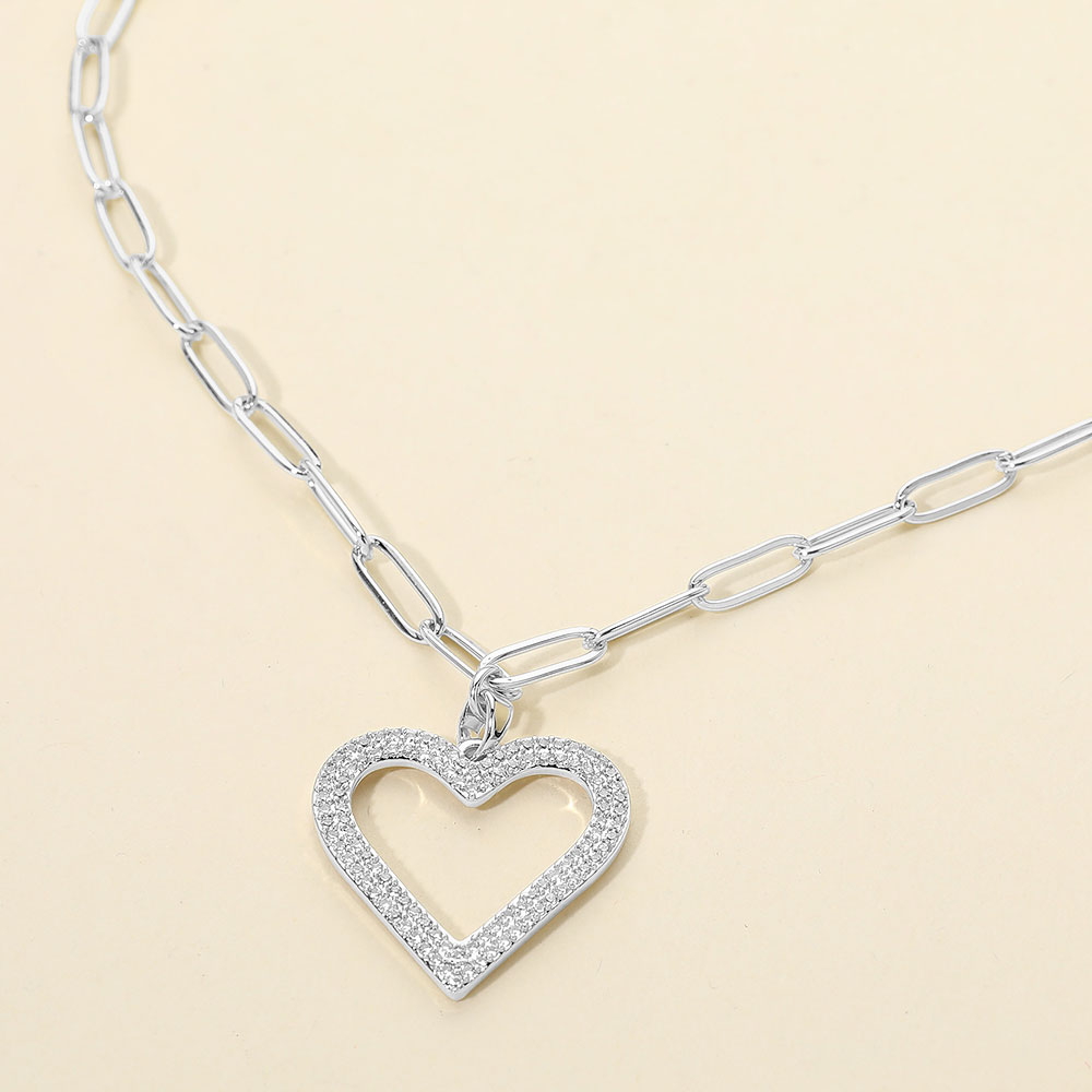 Stainless Steel CZ Stone Paved Open Heart Pendant Paperclip Chain Necklace