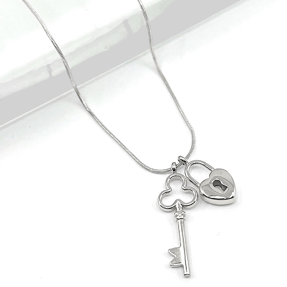 • Stylish stainless steel necklace with dual pendants—a heart-shaped lock and matching key—symbolizing love and connection. A unique accessory perfect for adding a romantic, meaningful touch to your everyday or special occasion outfits.
