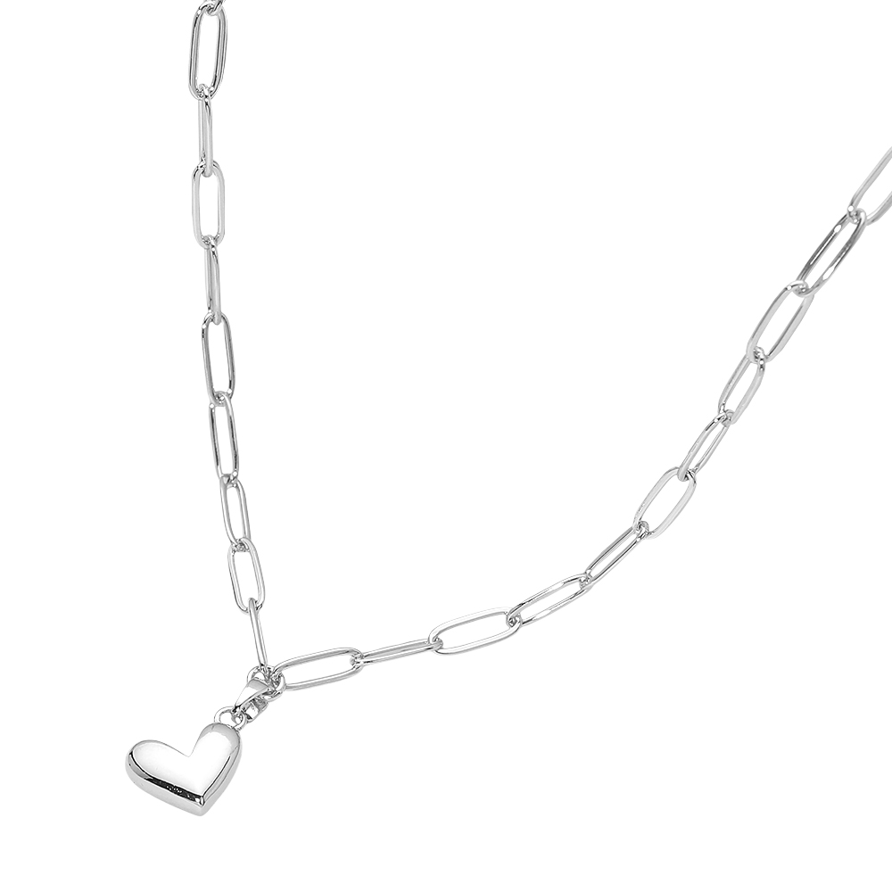 Details • Necklace Size : 15.75" + 2.25" L • Pendant Size : 0.5" X 0.75" • This paperclip chain heart pendant necklace features a smooth heart charm paired with a modern elongated link chain for a clean, minimalist look. Perfect for everyday wear or layering, it offers timeless appeal and meaningful style, making it ideal for gifting, boutique collections, and contemporary jewelry assortments. • Stainless Steel