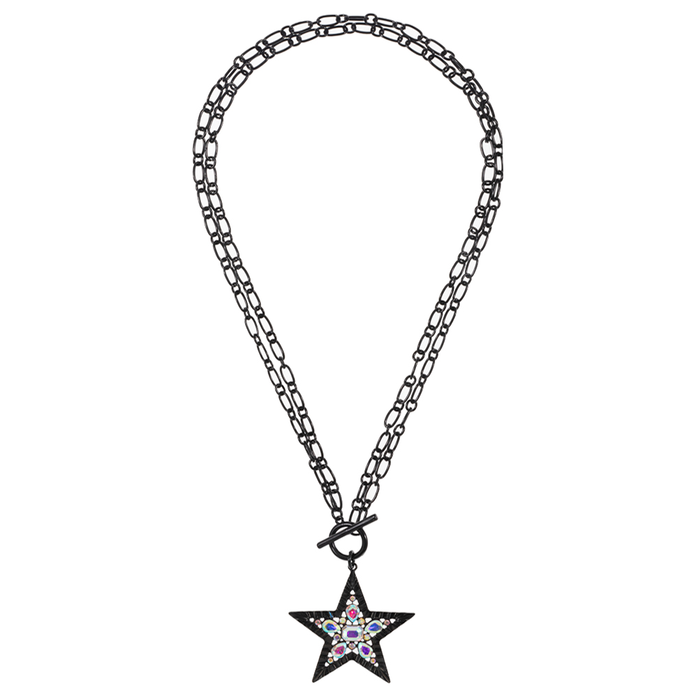 Rhinestone Embellished Safety Pin LOVE Star Centered Enamel Heart Pendant Necklace