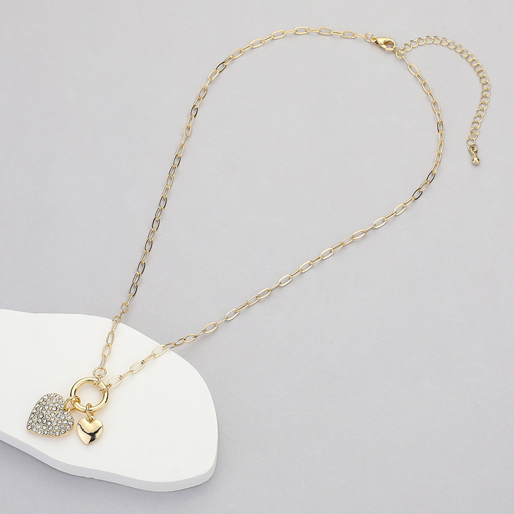 Stone Paved Metal Heart Charms Pendant Paperclip Chain Necklace