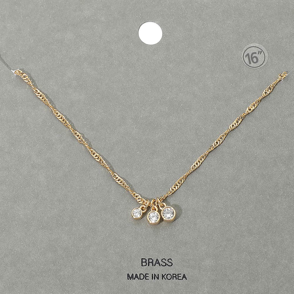 Details • Necklace Size : 16" + 3" L • Pendant Size : 0.3" L • This elegant pendant necklace features three small round accents suspended from a delicate chain, creating subtle movement and refined shine. Designed for effortless everyday wear, it layers beautifully with other necklaces or stands alone for a polished look. A versatile jewelry piece ideal for casual styling, office outfits, gifting, and boutique collections seeking timeless, minimal accessories. • Brass • Lead and Nickel Compliant • Made In Korea