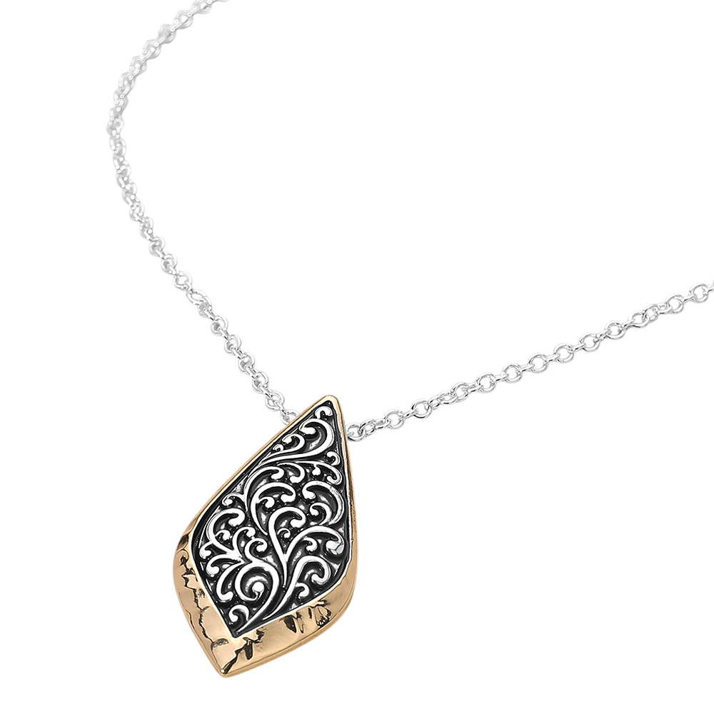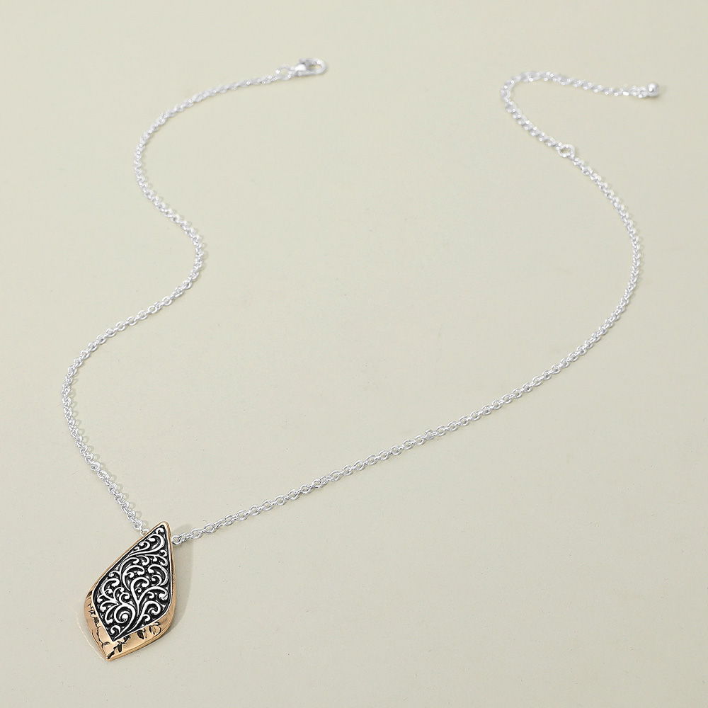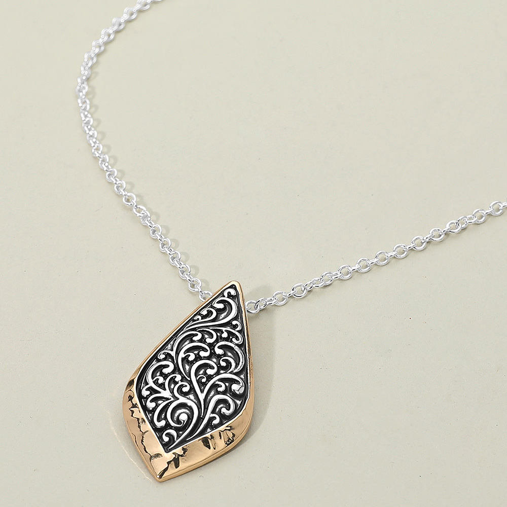 • Elevate your look with this artisan leaf pendant necklace featuring an elegant scrollwork pattern and refined two-tone finish. Its unique craftsmanship blends classic artistry with modern sophistication, making it a standout accessory for any occasion.