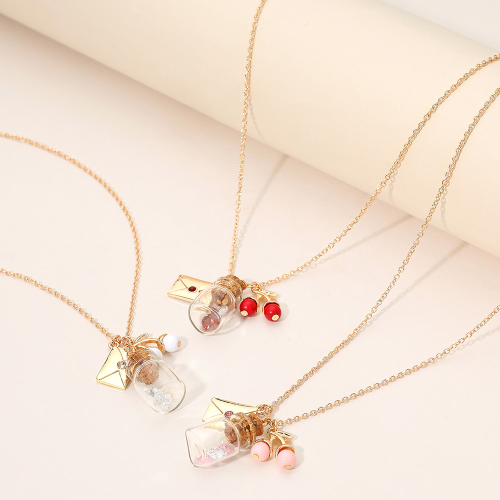 Whimsical Glass Bottle Envelope Cherry Charm Pendant Necklace
