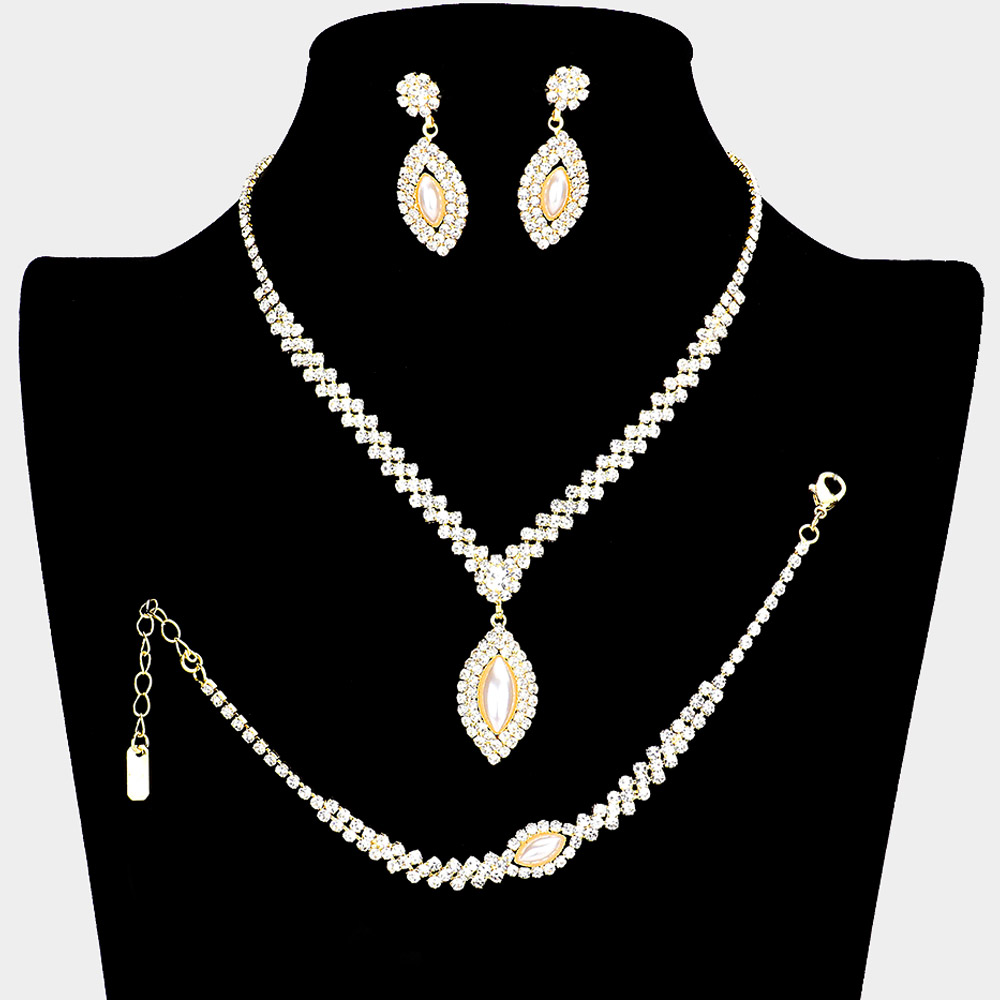 3PCS - Crystal Rhinestone Oval Pearl Dangle Necklace Jewelry Set