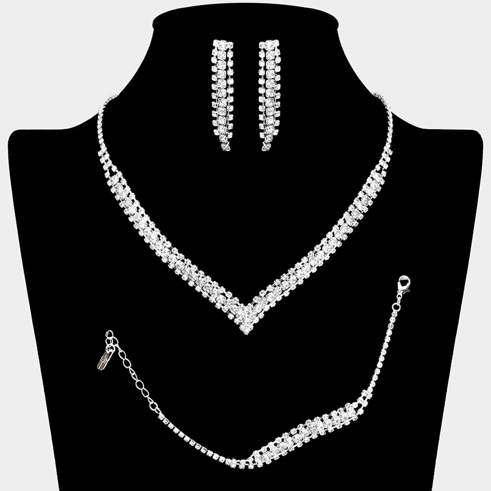 • Elevate any special occasion with this refined jewelry set featuring a matching necklace, bracelet, and earrings. Its sparkling rhinestone arrangement creates a cohesive, eye-catching look designed to enhance formal outfits with timeless sophistication and graceful shine.