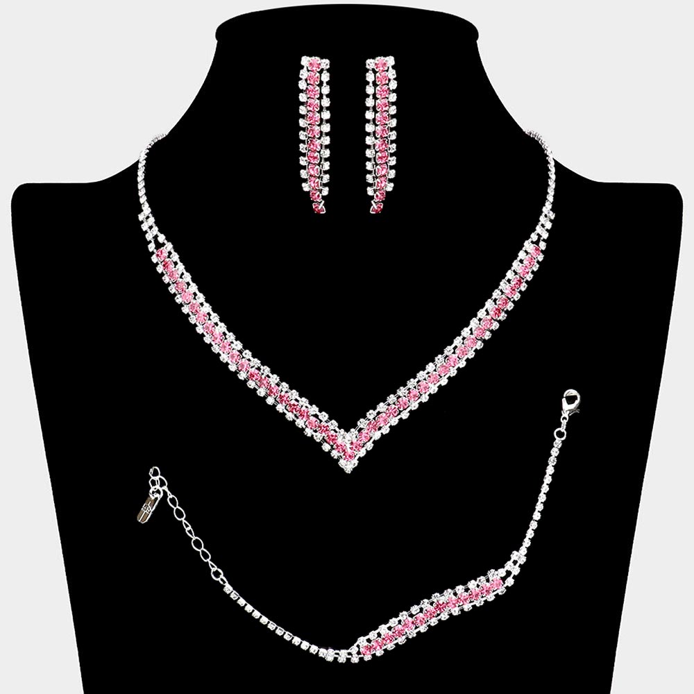 • Elevate any special occasion with this refined jewelry set featuring a matching necklace, bracelet, and earrings. Its sparkling rhinestone arrangement creates a cohesive, eye-catching look designed to enhance formal outfits with timeless sophistication and graceful shine.