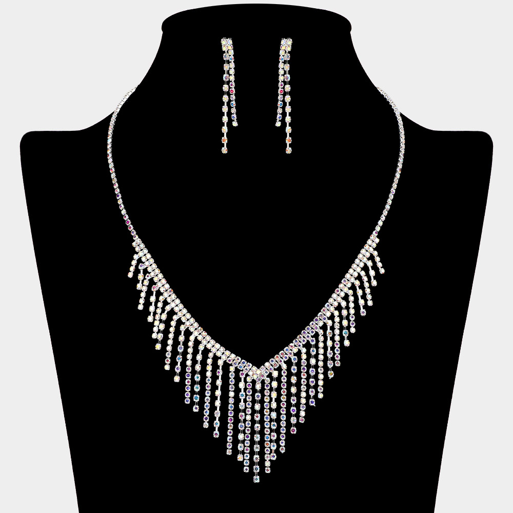 • Add a touch of dramatic elegance with this Cascading Fringe Crystal Necklace and Earring Set. Designed with layered strands of shimmering stones that flow beautifully, this statement set enhances evening gowns and formal attire with radiant sparkle and sophisticated allure for any special occasion.
